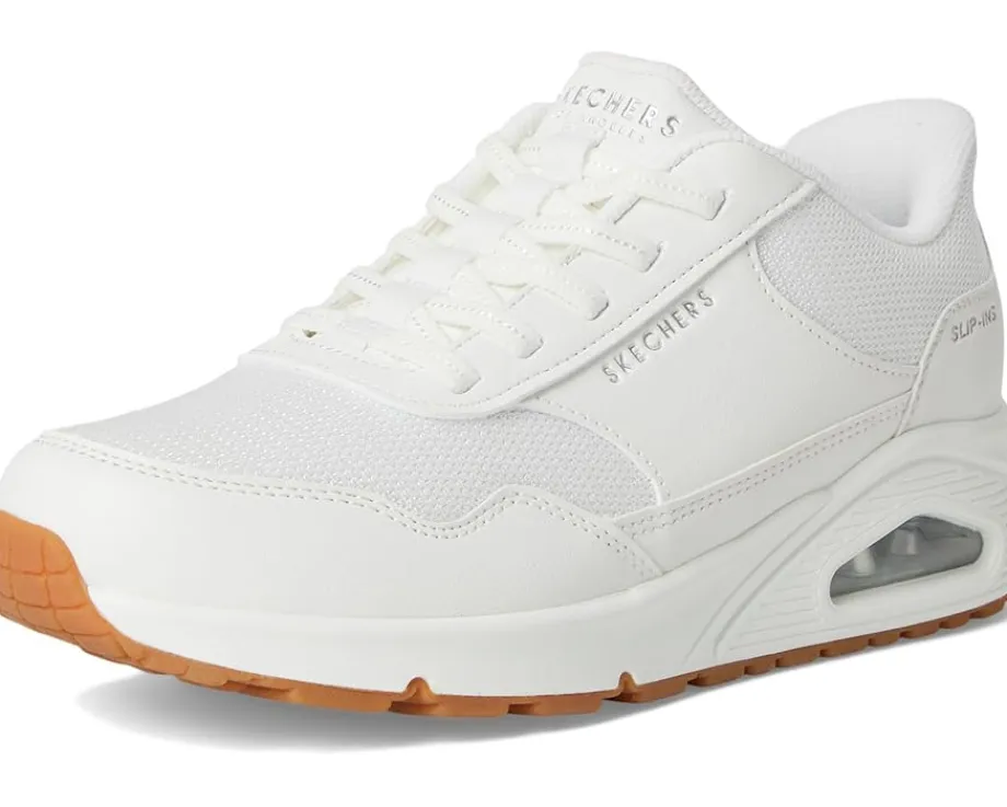 - Experience the future of footwear. The Uno – Banksia Slip-Ins by Skechers® redefine convenience with the innovative Hands Free Slip-Ins design, allowing you to effortlessly slip them on and off. Feel the support of the exclusive Heel Pillow™ that cradles your foot, while the Skech-Air visible air-cushioned midsole provides lightweight bounce. Indulge in the luxurious comfort of the Skechers Air-Cooled Memory Foam® insole, designed to adapt to your unique foot shape. The flexible traction rubber outsole ensures confident strides, making these slip-ins perfect for everyday wear.