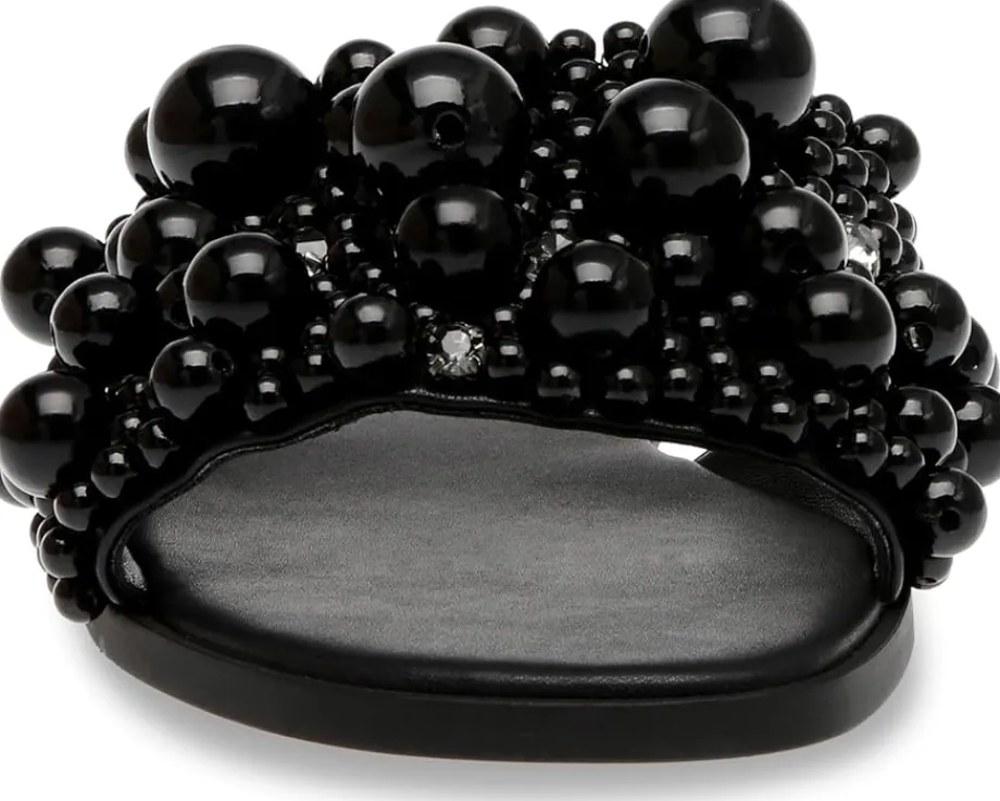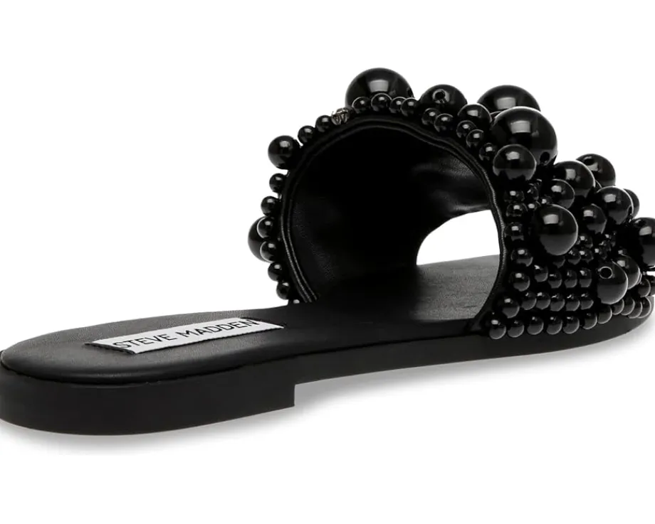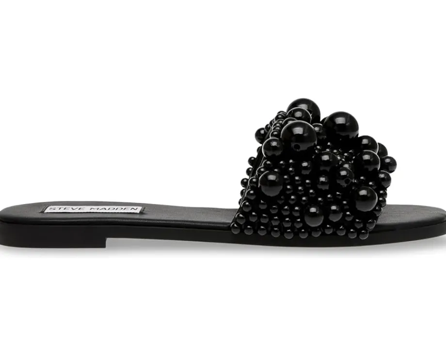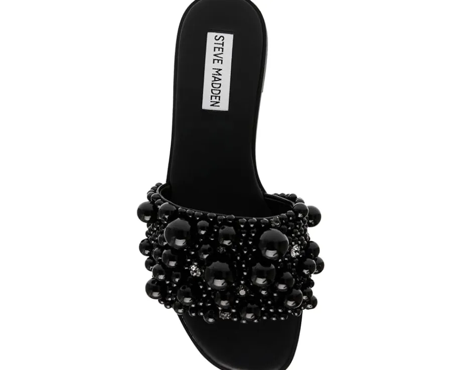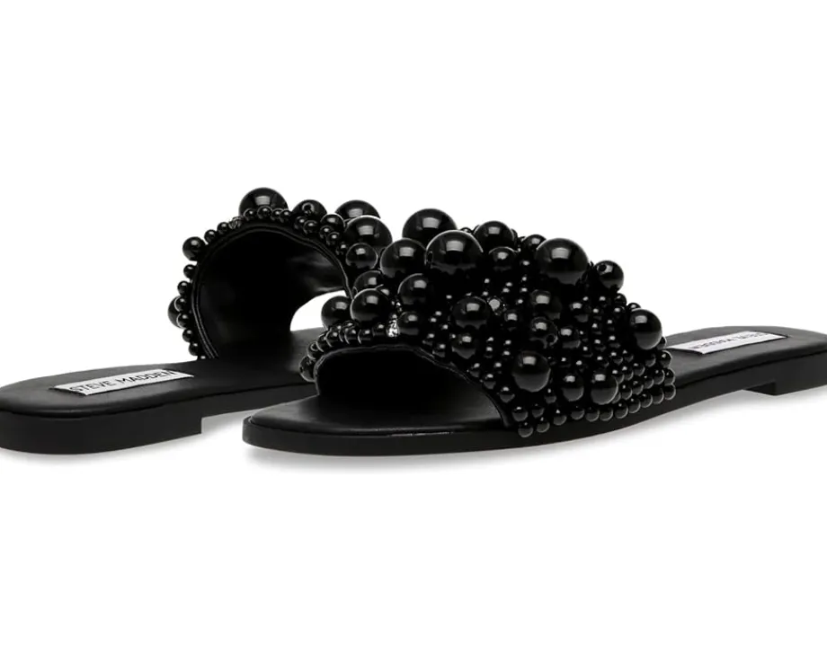 - Be the dancefloor diva fashionably and comfortably wearing the Steve Madden® Knicky Sandals. The slip-on footwear features synthetic rubber upper construction with faux pearl embellished strap and open square toe silhouette.