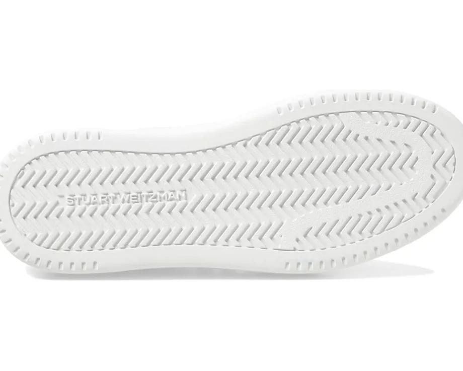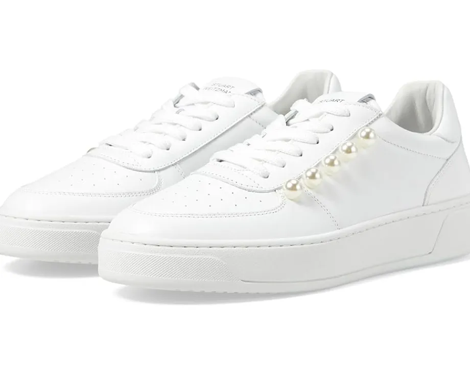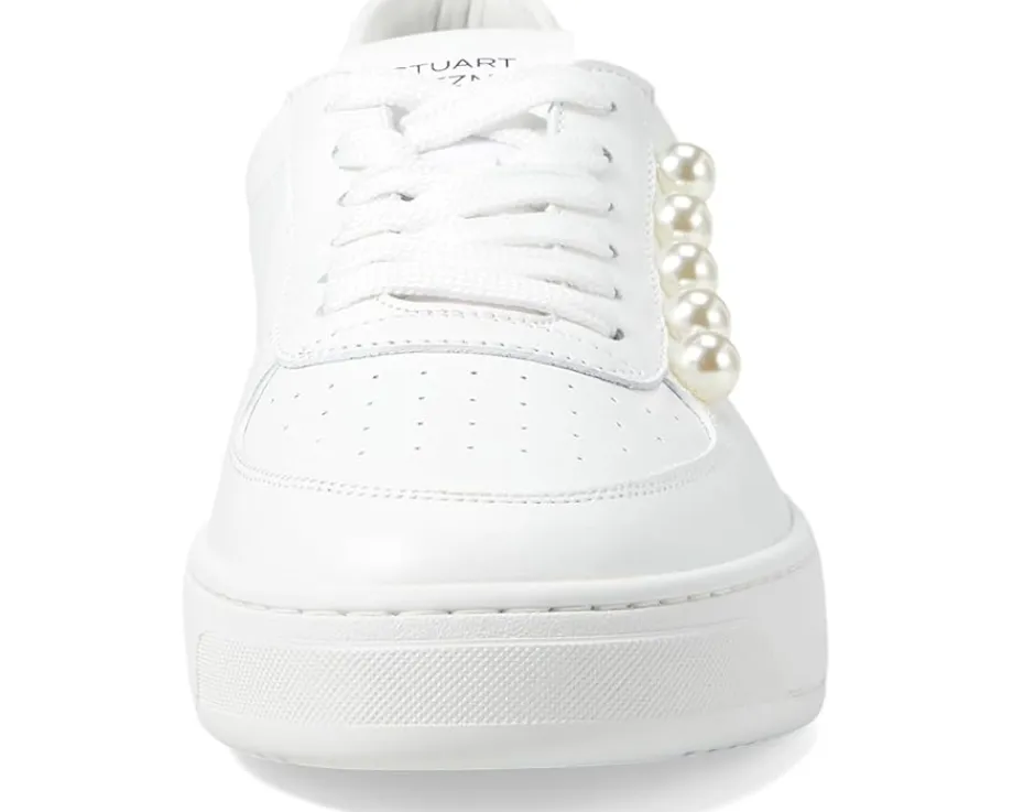 - Stride with confidence wearing the timeless and iconic Stuart Weitzman® Courtside Pearl Sneaker. Crafted from leather upper, lining and insole, this pair of cute shoes features low-top silhouette, round toe, faux pearl detailing on one side, lace-up closure and brand detailing on the tongue and footbed.