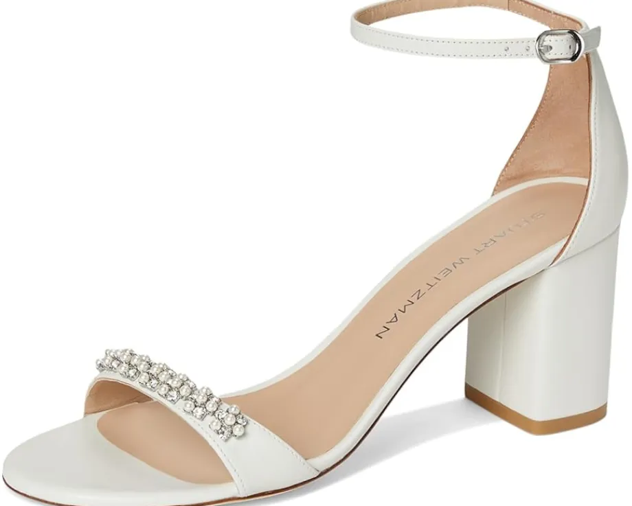 - Stuart Weitzman® Nudist Poppy Block 75: Experience the epitome of luxury and comfort. Crafted with luxurious lamb leather upper and embellished with lacquered nappa, crystal, and pearl accents, these sandals exude sophistication from every angle. The block heel provides the perfect balance of style and comfort, while the cow leather outsole ensures durability. Featuring an open-toe design and a secure buckle ankle strap closure, this versatile sandal is perfect for elevating any look, from daytime chic to evening glam.