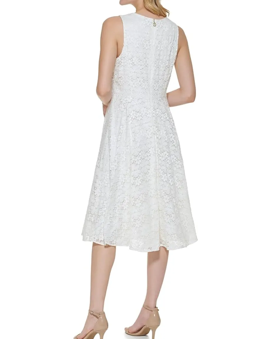 - Add some flair to your look wearing the Tommy Hilfiger® Daisy Lace Fit and Flare. This fully lined dress features V-neckline, sleeveless style, below the knee length, and allover lace detailing.