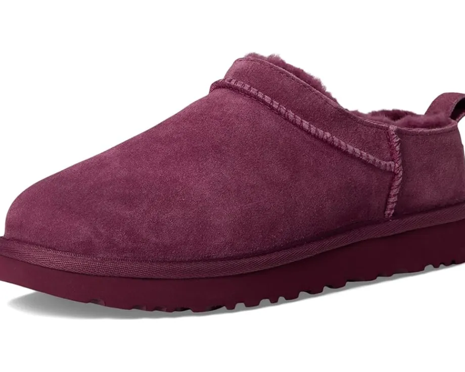 - The UGG® Classic Micro boots reimagine the fan-favorite classic boots with a new, low-profile design (and high-profile comfort). They have a genuine suede upper lined with soft fur lining and an insole that naturally regulates temperature, so you can wear socks – or not. Their lightweight sugarcane ethylene vinyl acetate outsole delivers effortless support and adds that easy slipper feeling to every out-of-the-house venture. These slip-on boots feature textile binding made from 100% recycled polyester fibers. Styled with a woven label with the UGG® logo on the insole and a UGG®-logo-embossed leather heel label, these ankle boots keep your feet comfortable, warm, and protected. While the Micro retains the strong DNA of the Classic boot, it’s fit will be closer to that of a Tasman than a Classic boot.