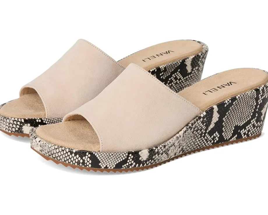 - Stride with confidence wearing the Vaneli® Calla wedge sandals. The slip-on footwear features suede upper construction with leather lining and rubber insole for added comfort.
