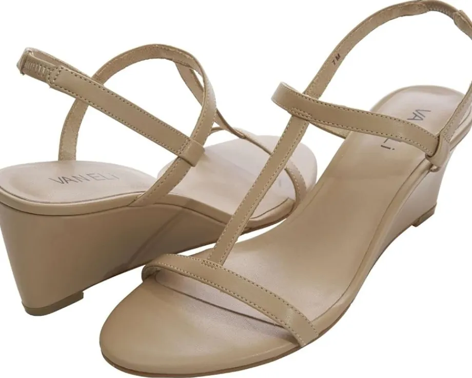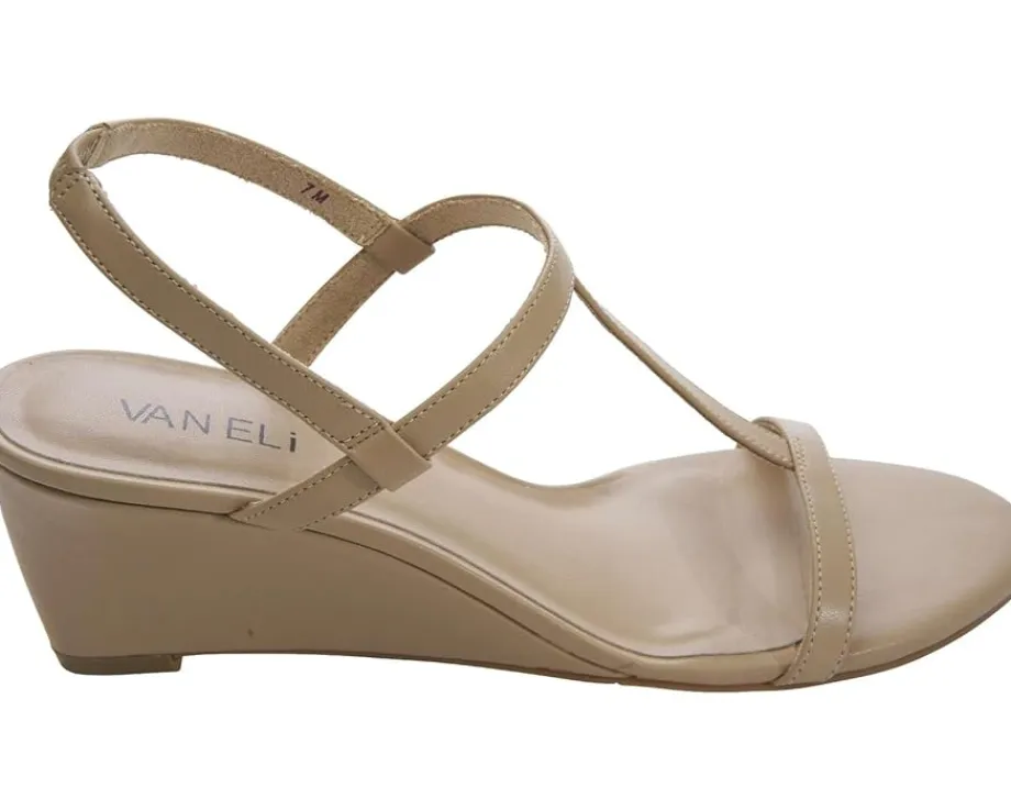 - Bring comfort to your feet and style to your look by wearing the Vaneli® Mohan. The slip-on style sandals have an open cap-toe design, strappy silhouette, buckle closure, and wedge heels for undeniable aesthetics. The lightweight heels have leather upper, lining, and faux leather insole for unparalleled comfort and support, making your feet feel like they’re walking on clouds.