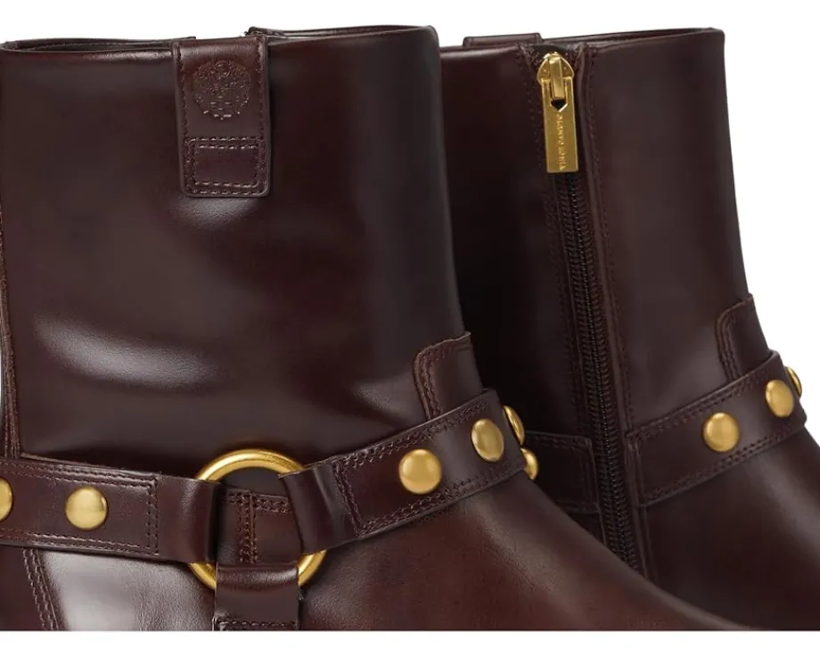 - Make a fierce statement with the Vince Camuto® Amais Biker Boots. Featuring a bold harness strap with shiny studs and ring accents, this moto boot blends edgy attitude with effortless style. The low stacked heel, rounded toe and padded footbed offer all-day comfort, while the striking detail ensures you stand out wherever you go. They have an inside zip for easy entry. Pair them with denim or a leather jacket for the ultimate chic look.