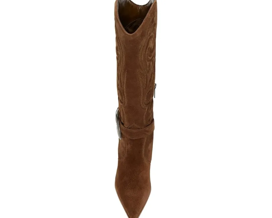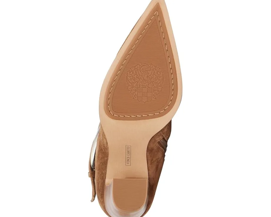 - Step into sophistication styling Vince Camuto® Biancaa Booties! Featuring a chic suede upper and knee-high length, these booties offer style and comfort with a polyester lining and insole. The pointed toe and ornate puffed stitch detail add elegance, while the oversized buckle and scalloped topline make a bold statement. Complete with a durable rubber outsole and side zippered closure for ease, these booties are your go-to for effortless fashion.