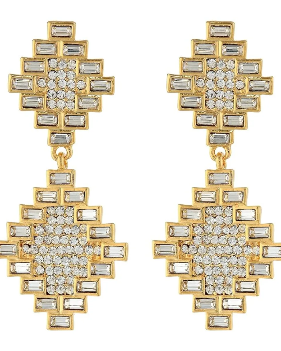 - Gold-tone drop earrings with Aztec inspired cut and faceted crystal embellishments.