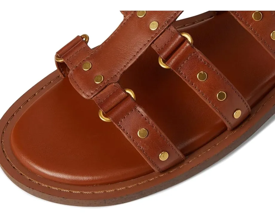 - Styled with a strappy design with metal rivets, the Vince Camuto® Claira Gladiator Flat Sandals are perfect to pair with different outfits and styles. The leather upper features an ankle strap with an adjustable buckle closure and a zippered back closure for easy wear. These flat sandals are made of a padded footbed and synthetic lining.