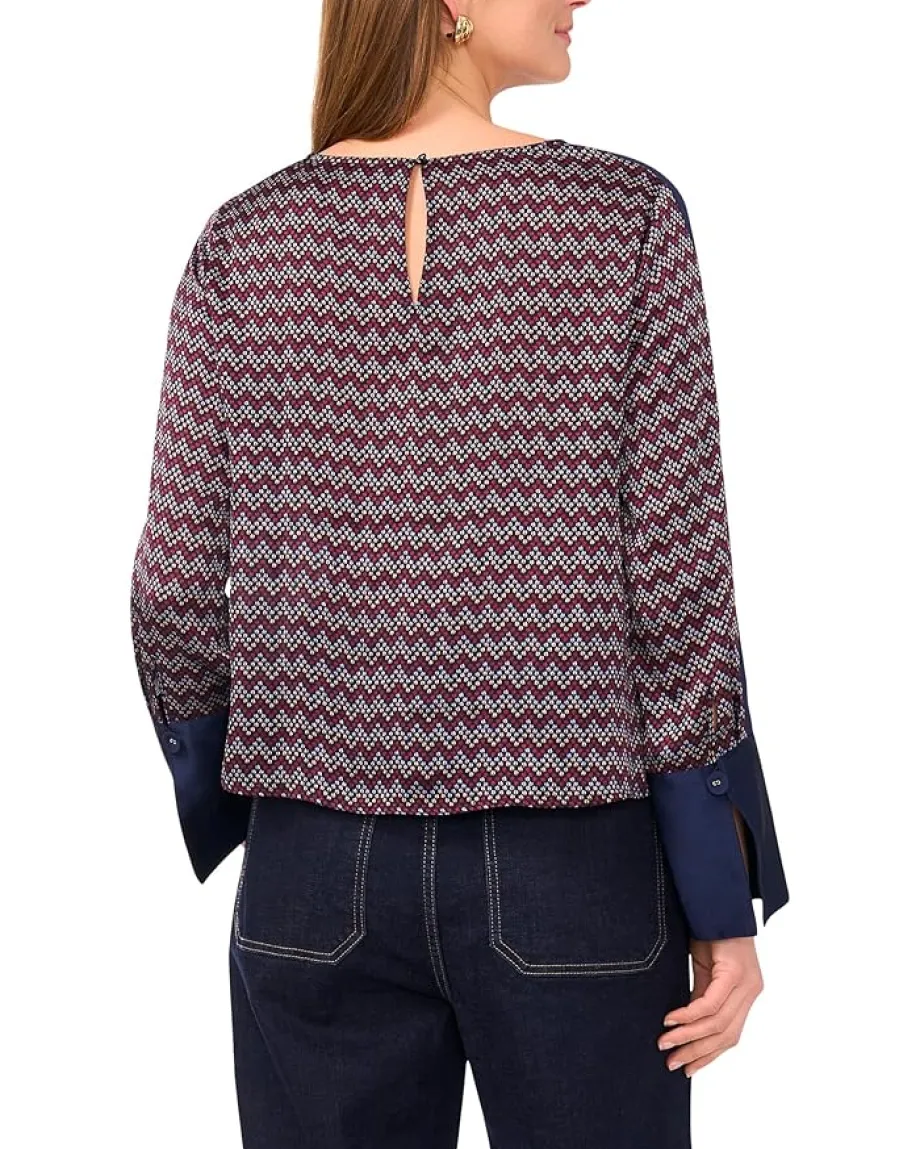 - The Vince Camuto® Crew Neck Extended Shoulder Long Sleeve Blouse with Wide Cuff is a must-have essential to your everyday style. Featuring a jewel neckline with long sleeves, flared button closure cuffs and a back keyhole with button-and-loop closure.