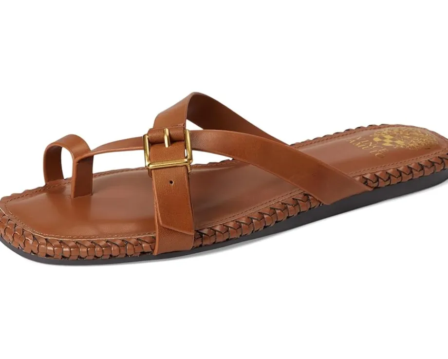 - Stride with confidence wearing the Vince Camuto® Kellon Toe Loop Flat Sandals. Crafted from leather upper, and polyurethane lining, this pair of sandals features open square toe, slip-on style, padded footbed, buckle detailing on the strap, and brand detailing on the footbed.