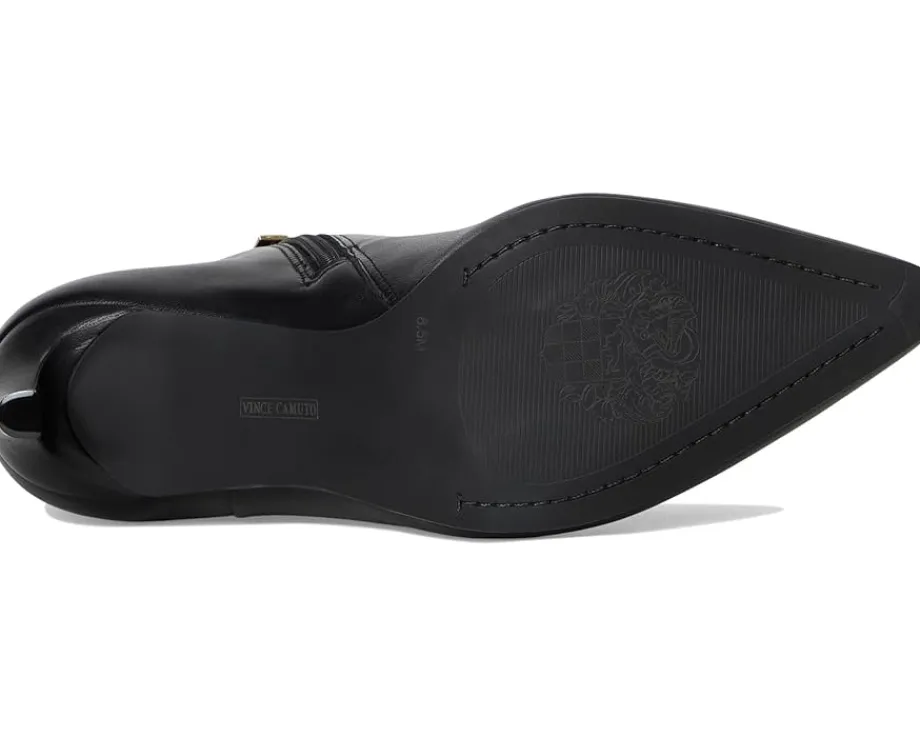 - Crafted from luxe leather upper, the Vince Camuto® Quinley boasts a chic snake print or matte metallic finish. Featuring a pointed toe, padded footbed, and trendy comma stiletto heel, this ankle-high bootie with a side zippered closure effortlessly transitions from denim to dresses, ensuring comfort and flair with every step.