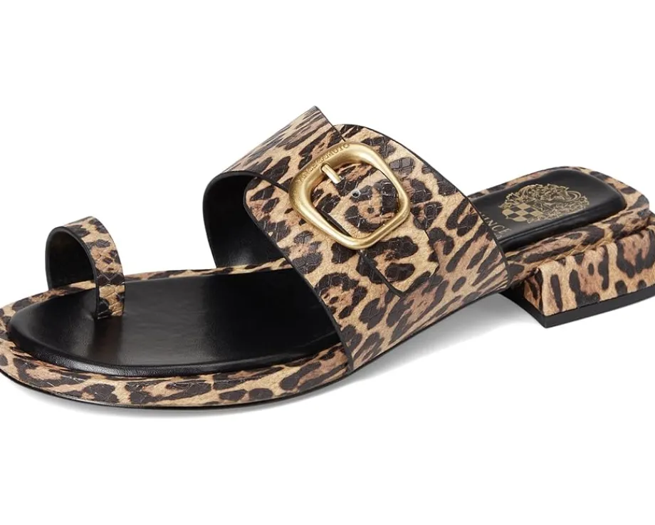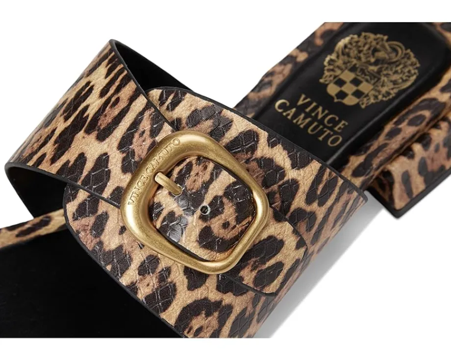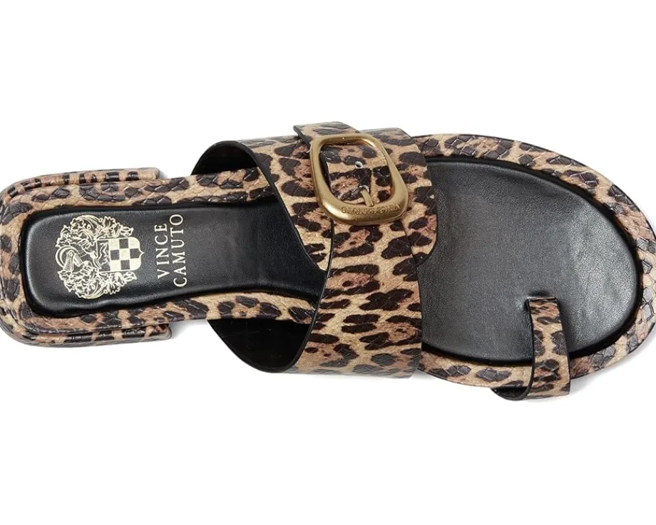 - The Vince Camuto® Ranista Buckle Band Sandals combine sophisticated design with everyday comfort. Featuring an open, round toe shape and are squared-off over the heels, these sandals offer a chic yet practical lift. They are equipped with a toe loop strap and an adjustable instep strap, complete with a bold metal buckle etched with the brand name for a touch of signature style. The padded footbed and rubber outsole ensure all-day comfort, making them the perfect choice for summer Fridays, whether you’re in or out of the office. These slide sandals are made of a leather upper, faux leather insole, and polyurethane lining. Lightweight and stylish, these leather sandals are a stylish and versatile wardrobe essential.