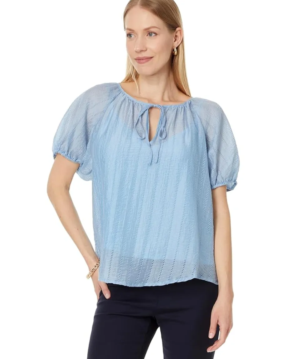 - Radiate in fashion-forward delight wearing the Vince Camuto® Shirred V Neck Blouse W Short Puff Slvs Top. It features a split V-neckline with tie-up closure, short puffy sleeves, and asymmetrical hem.