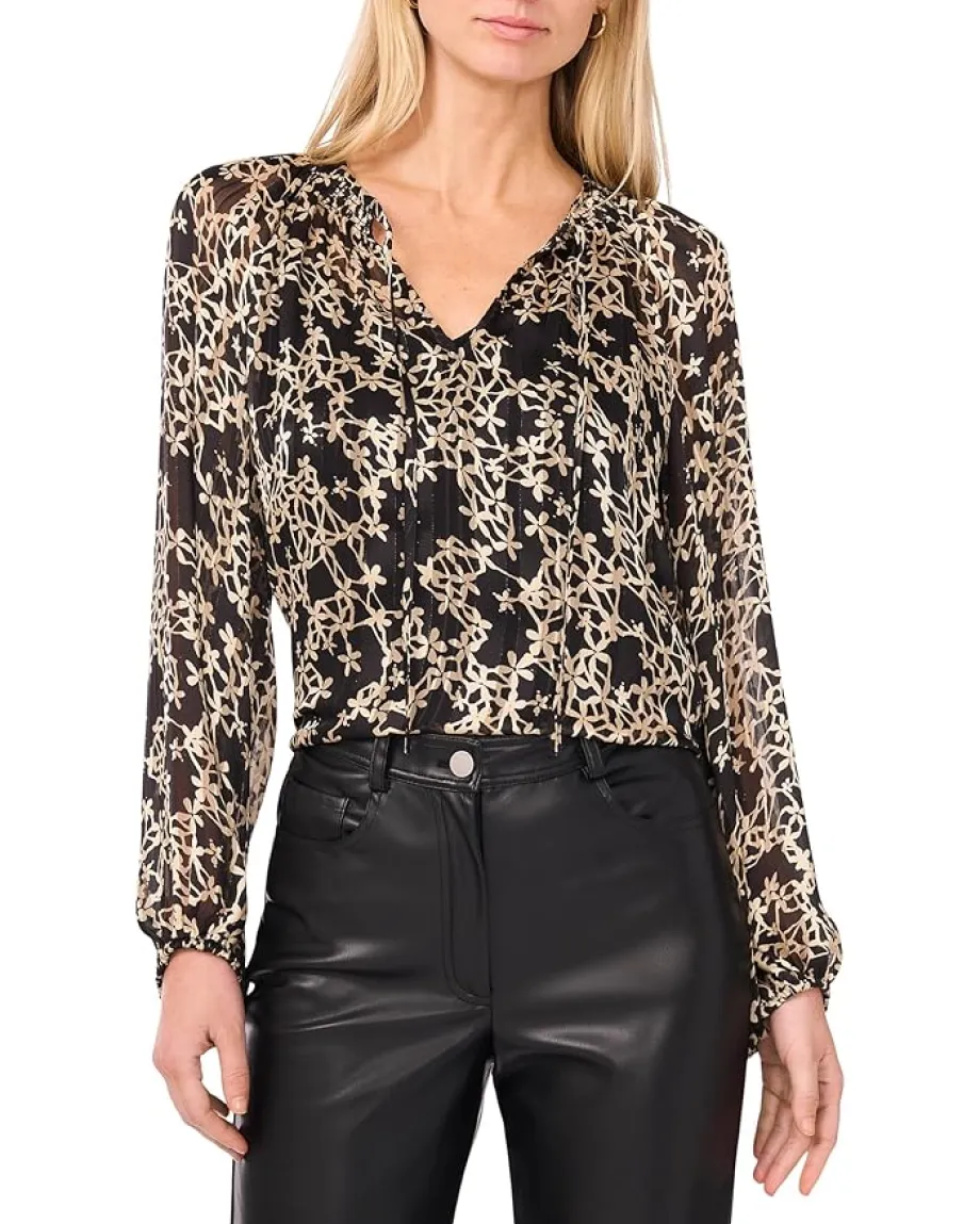 - Shine effortlessly wearing the Vince Camuto® Tie Neck Shirring Long Sleeve Top, while elegance meets comfort. The pull-on style top features a V-neckline with tie-up detail, long sleeves, a straight hem, and a subtle allover print.