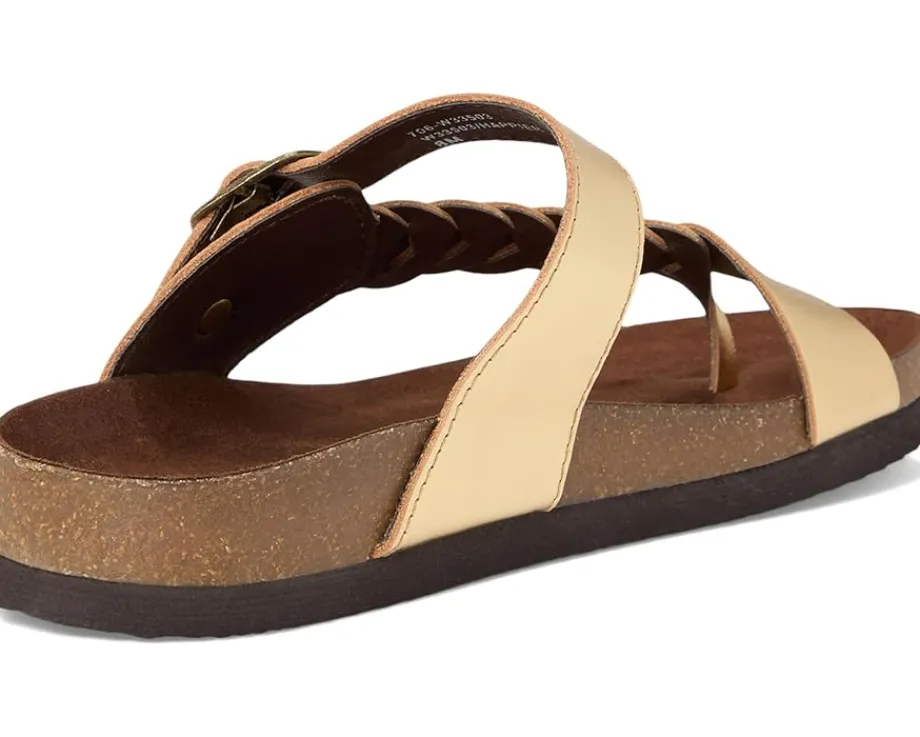 - Introducing White Mountain® Happier, where comfort meets style in a blissful fusion. Crafted with a supple leather upper and cozy faux suede lining, it boasts a contoured footbed for unparalleled support. The adjustable buckle and woven strap design ensure a customizable fit, while the faux leather outsole and insole offer durability and lasting comfort.