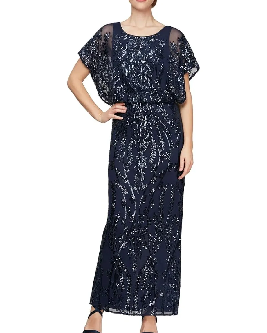 - The Alex Evenings™ Long Blouson Column Dress with Flutter Dress comes with a regular fit and bedazzled detailing allover. Featuring a zippered back for a secure fit, the long blouson dress comes with flutter sleeves which accentuates the overall structure. Add this scoop neck dress to your collection.