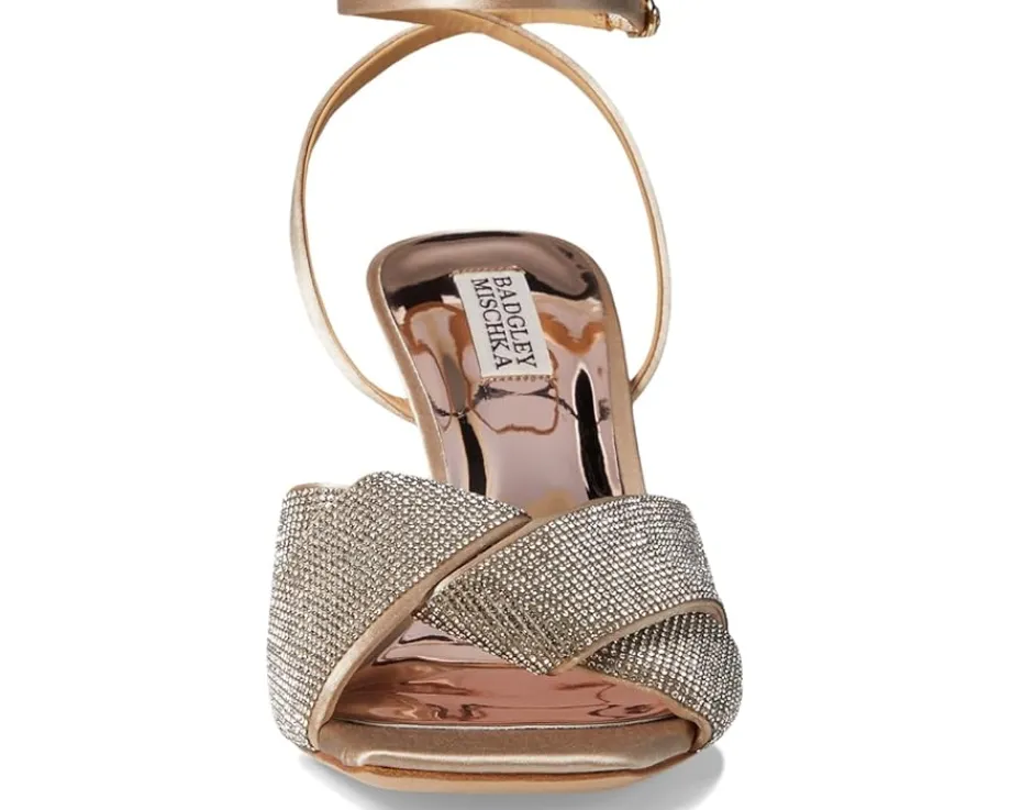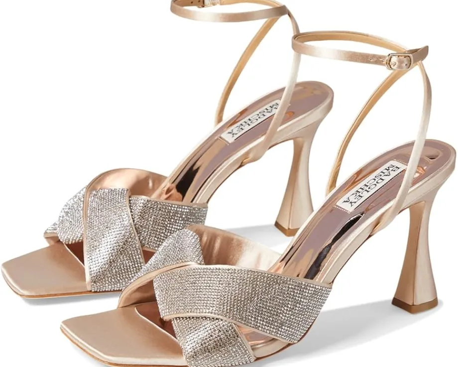 - Make a glamorous entry into any party or event wearing the Badgley Mischka® Brinlee heels. The silk upper of these sandals features rhinestone detailing for an eye-catching appeal. These heeled sandals come with a foam insole and breathable leather lining that makes them comfortable to wear for long hours. From your cocktail dresses to chic gowns, these leather heels add an eye-catching twist to your outfits and styles.
