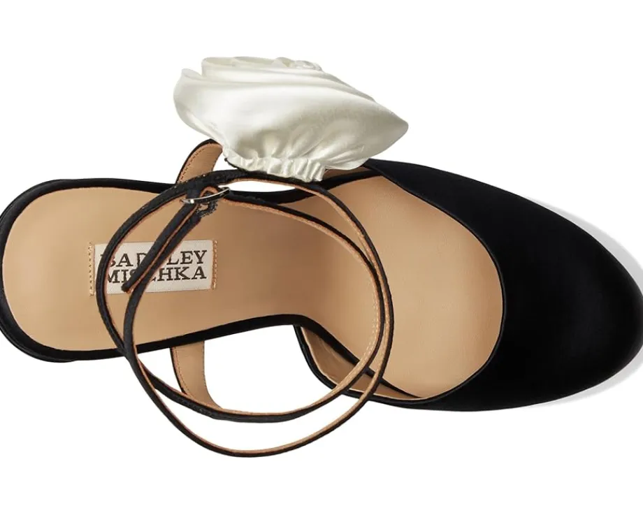 - Discover a new level of elegance wearing Badgley Mischka® Janessa – a stunning blend of sophistication and statement-making style. Featuring a luxurious silk upper adorned with an oversized flower, these platform pumps are your go-to for standout occasions. The leather lining and outsole promise breathable comfort, while the EVA insole cushions every step. A sleek buckle ankle strap ensures a secure fit, and the block heel adds height with stability.