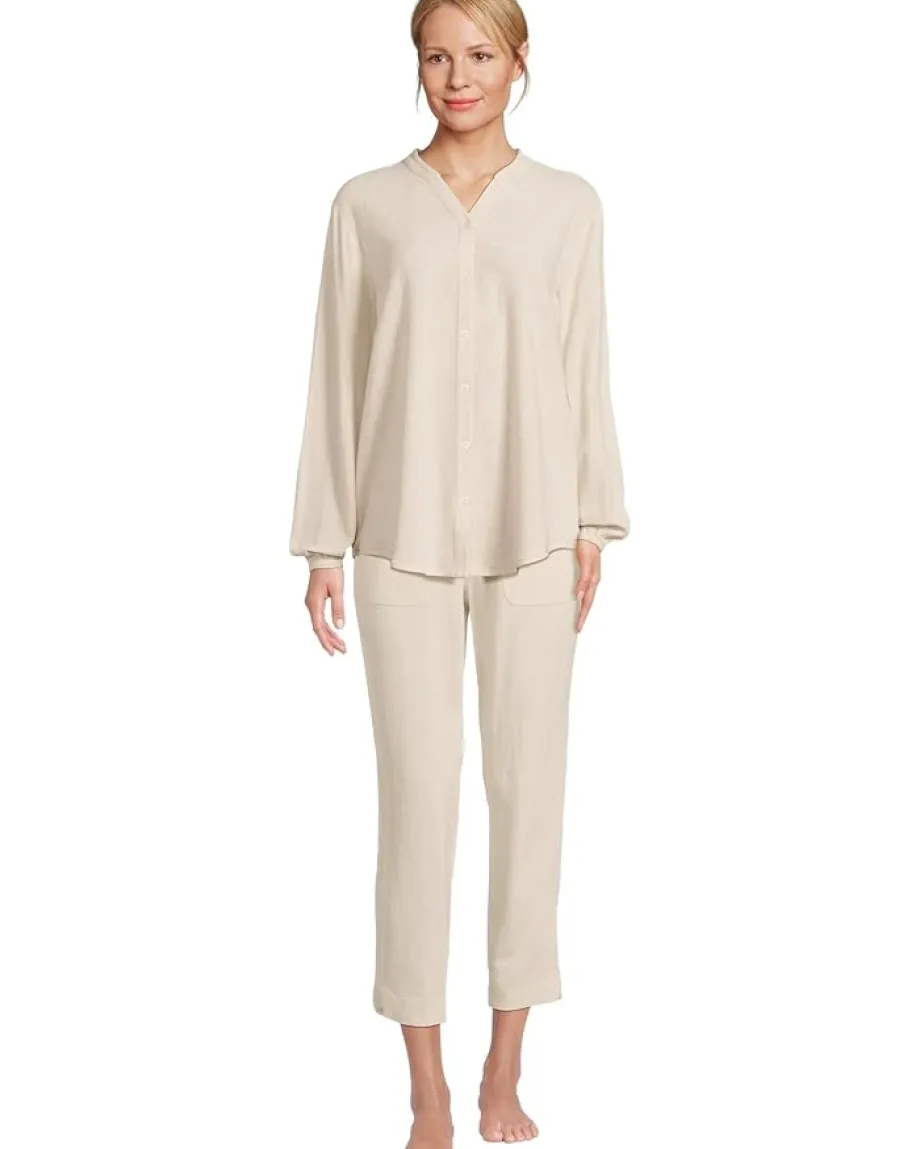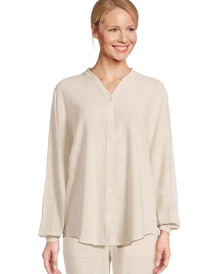 - The Barefoot Dreams® Linen Blend Blouse features a softened, relaxed look. This lightweight shirt will keep you comfortable and fashionable no matter the season. It has a notched V-neckline and long sleeves with elasticized cuffs.