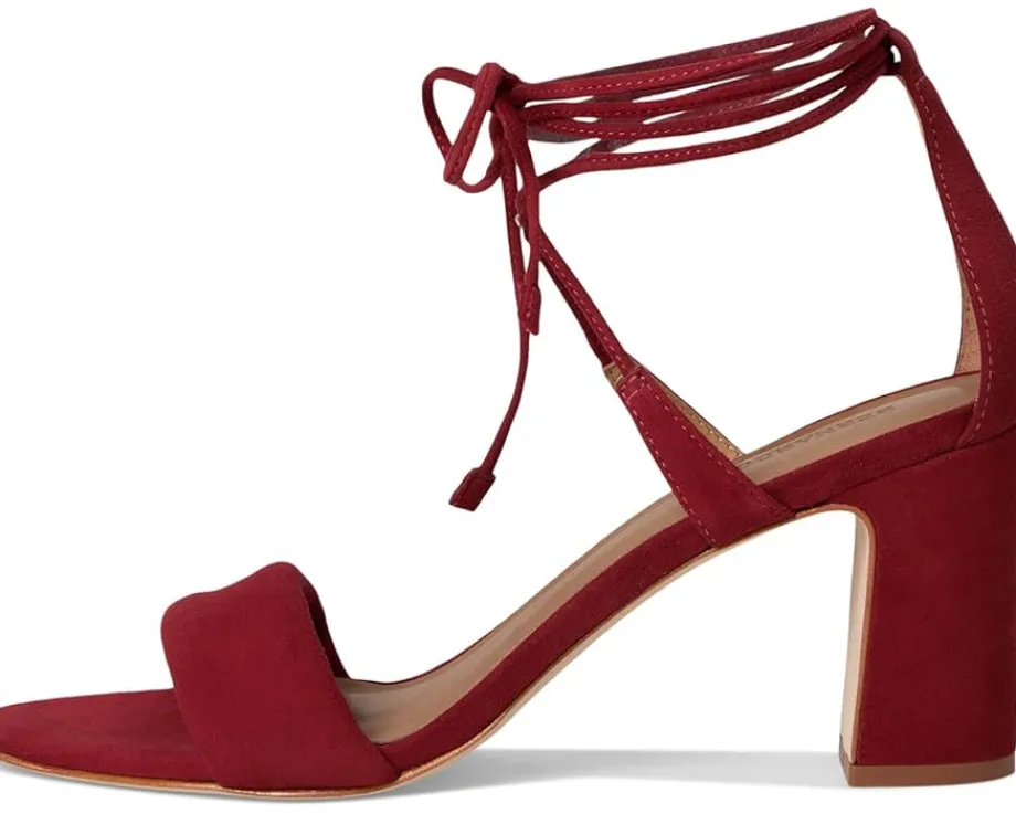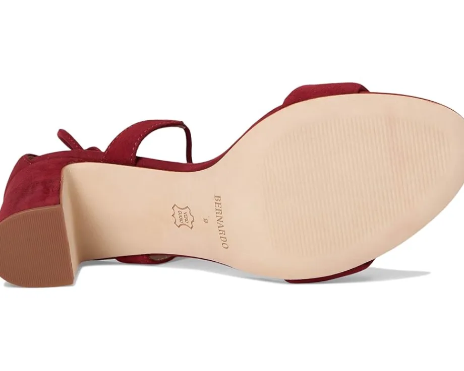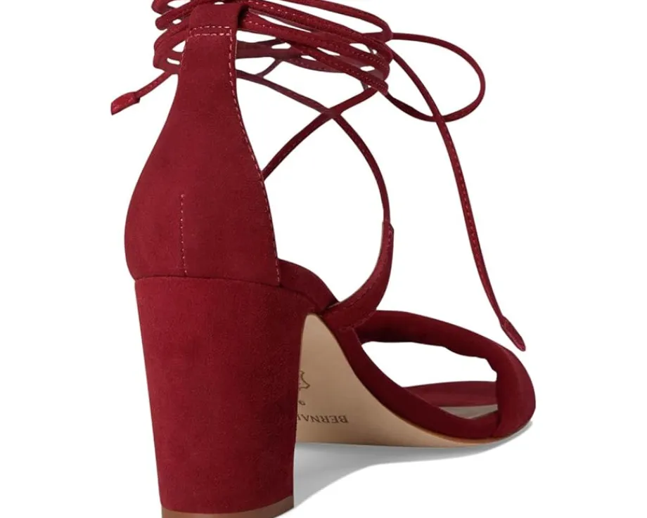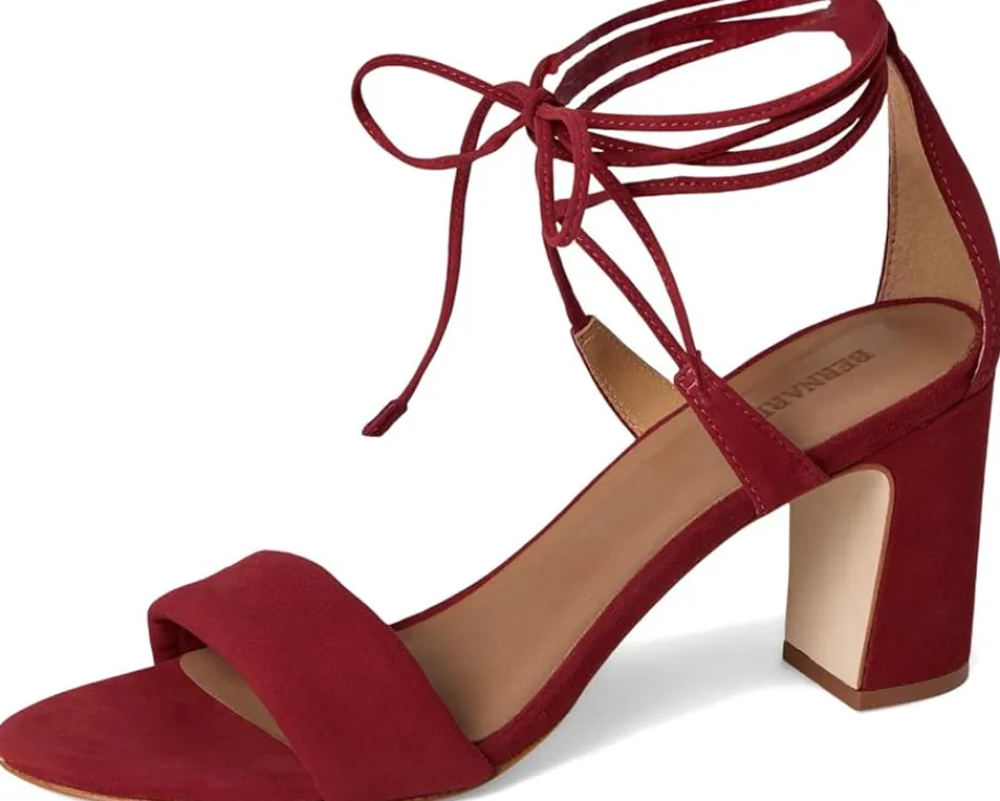 - Bound by luxury. This Bernardo® Ieda block heeled sandal, crafted in luxurious kid suede, features a sleek toe strap and delicate wraparound ankle ties for a secure and flattering fit. Perfect for parties, this pair of sandals features open round toe, strappy design with tie closure, and brand detailing on the footbed.