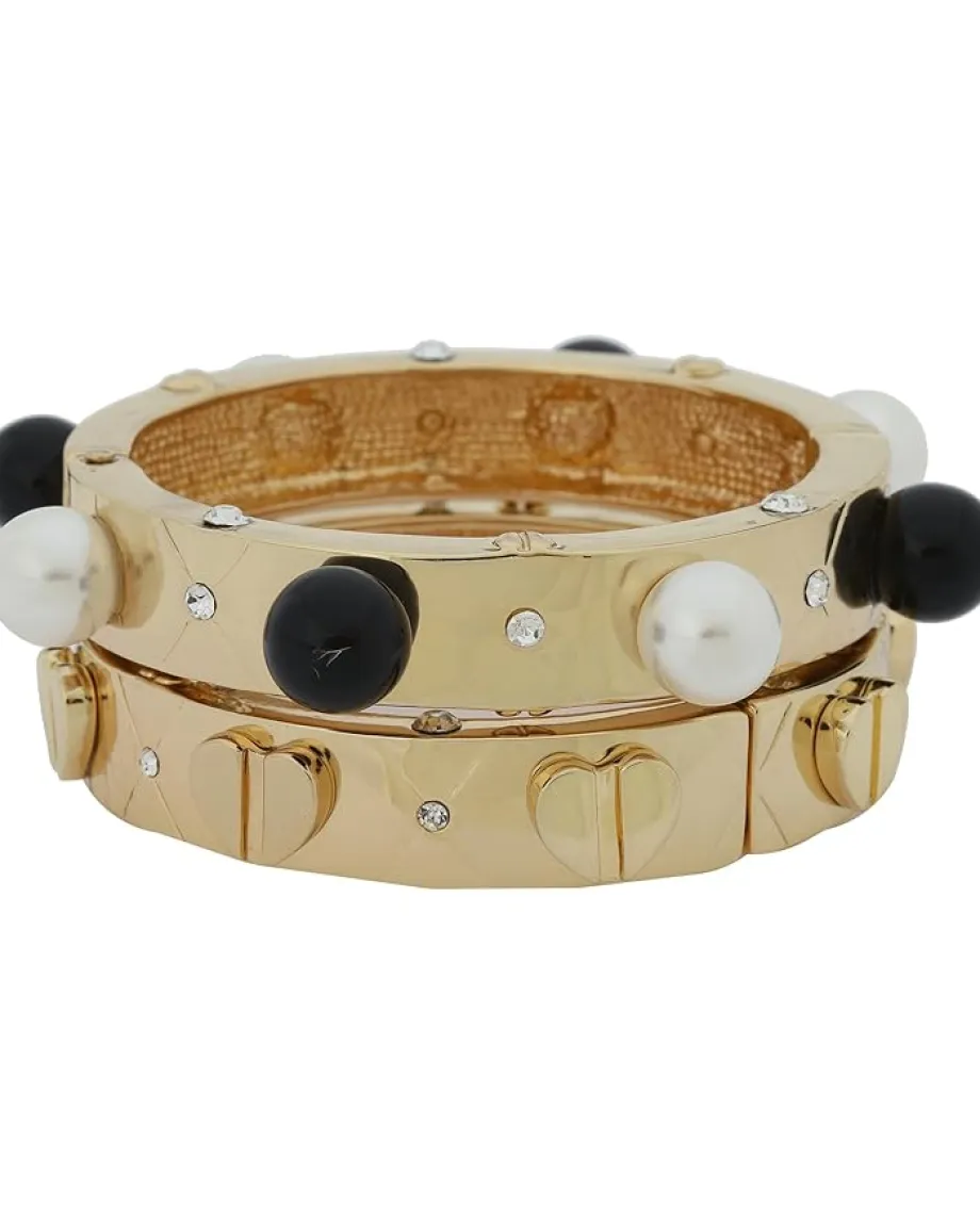 - One bangle features raised hearts with delicate rhinestone accents. The other bangle features white and black faux pearls with delicate rhinestone accents.
