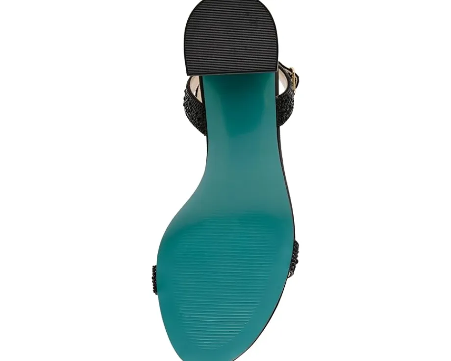 - Let the twinkling rhinestones define your uniqueness in style wearing Blue™ by Betsey Johnson Jean Sandals. The block heel footwear features PVC upper construction with adjustable buckle closure along the ankle strap and synthetic rubber outsole.
