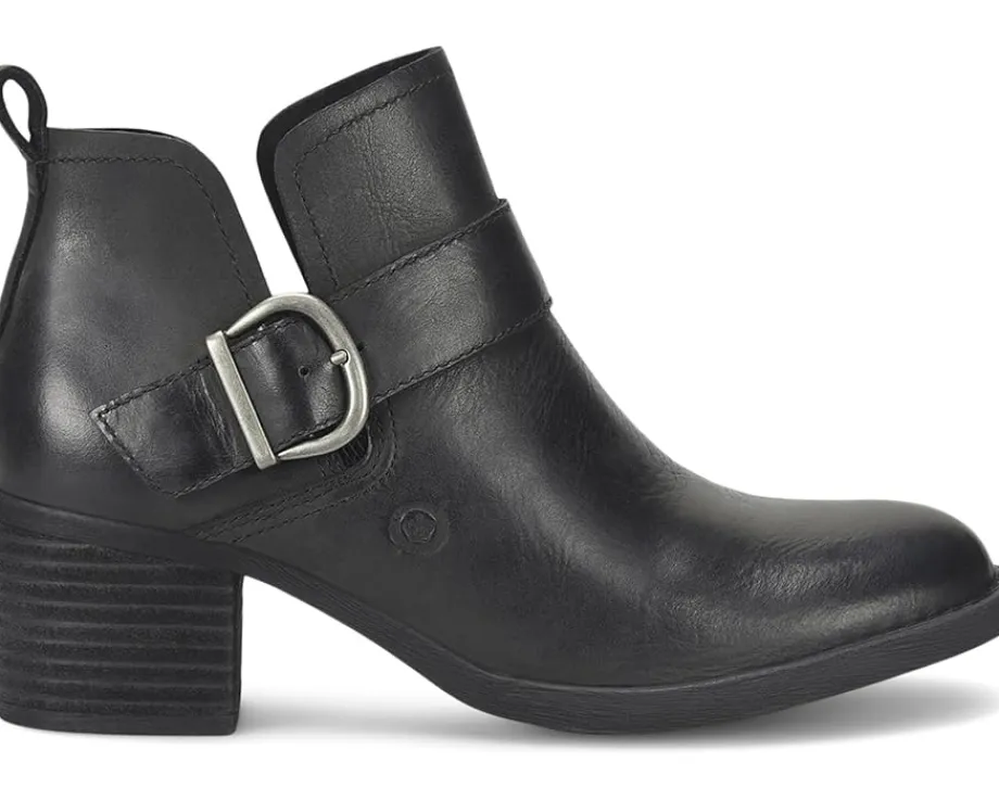 - Børn®’s low-heeled boot, accentuated by a chic side buckle, adds a touch of sophistication to this versatile and comfortable footwear choice. Crafted from a hand-finished full grain leather upper, breathable soft fabric suede lining, and a soft fabric suede covered footbed with extra foam for added comfort.