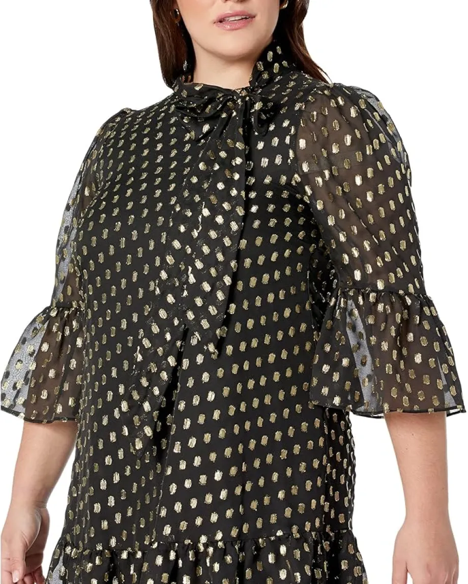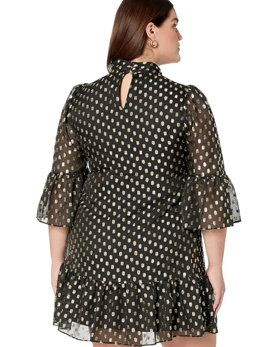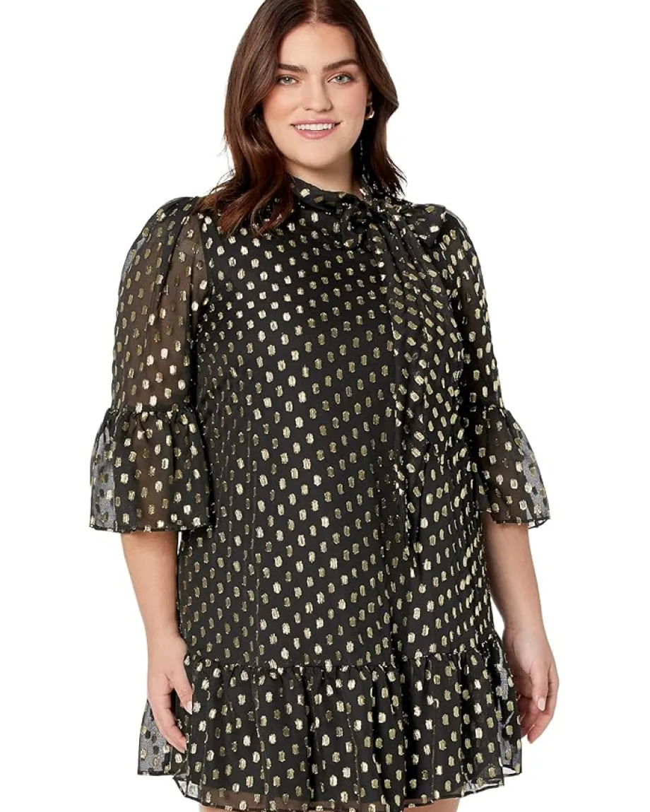 - A chic mini-length Calvin Klein® Dot Dress with Bell Sleeves, which never fails to look your best.
