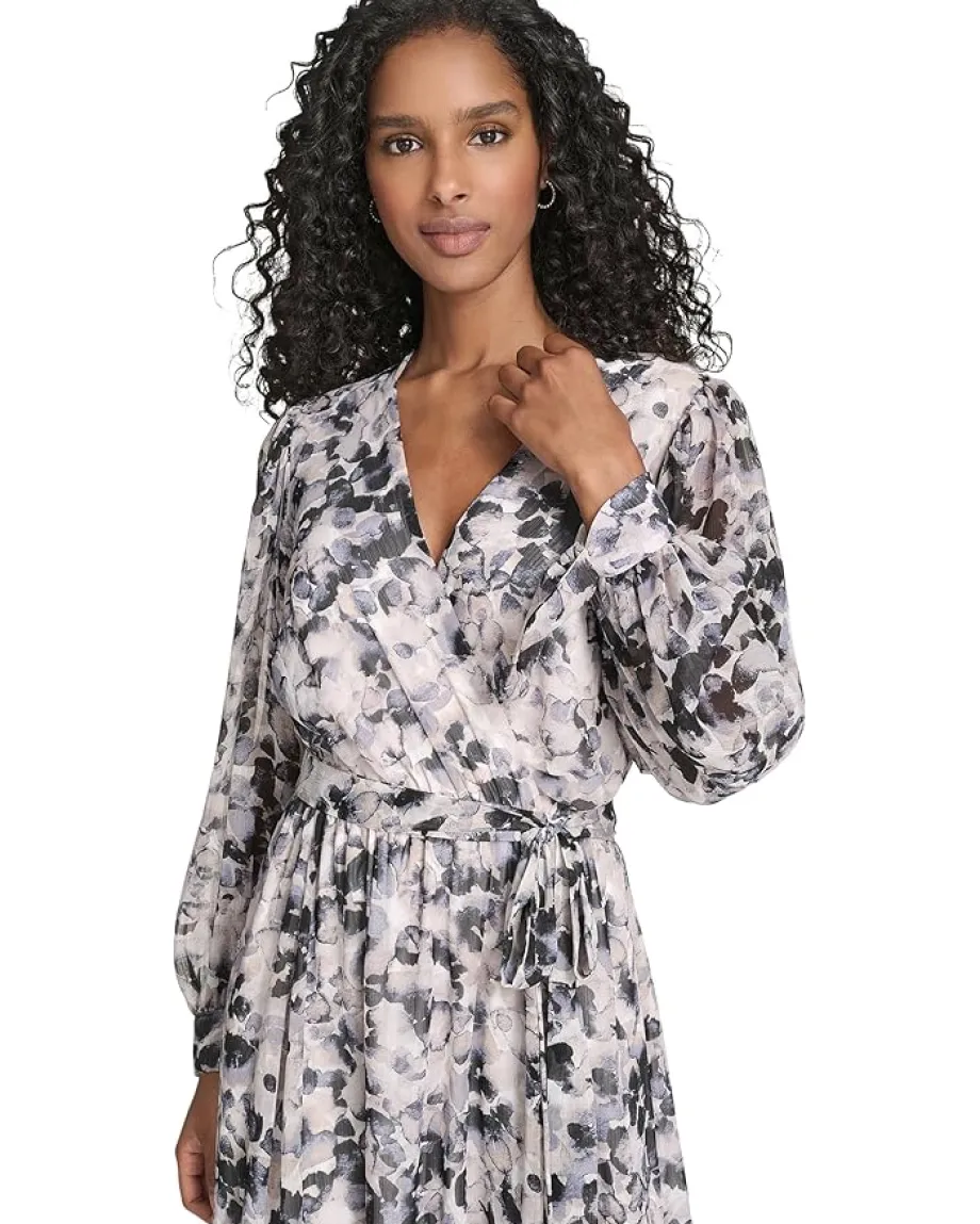 - The Calvin Klein® V-Neck Long Sleeve Chiffon Midi dress.