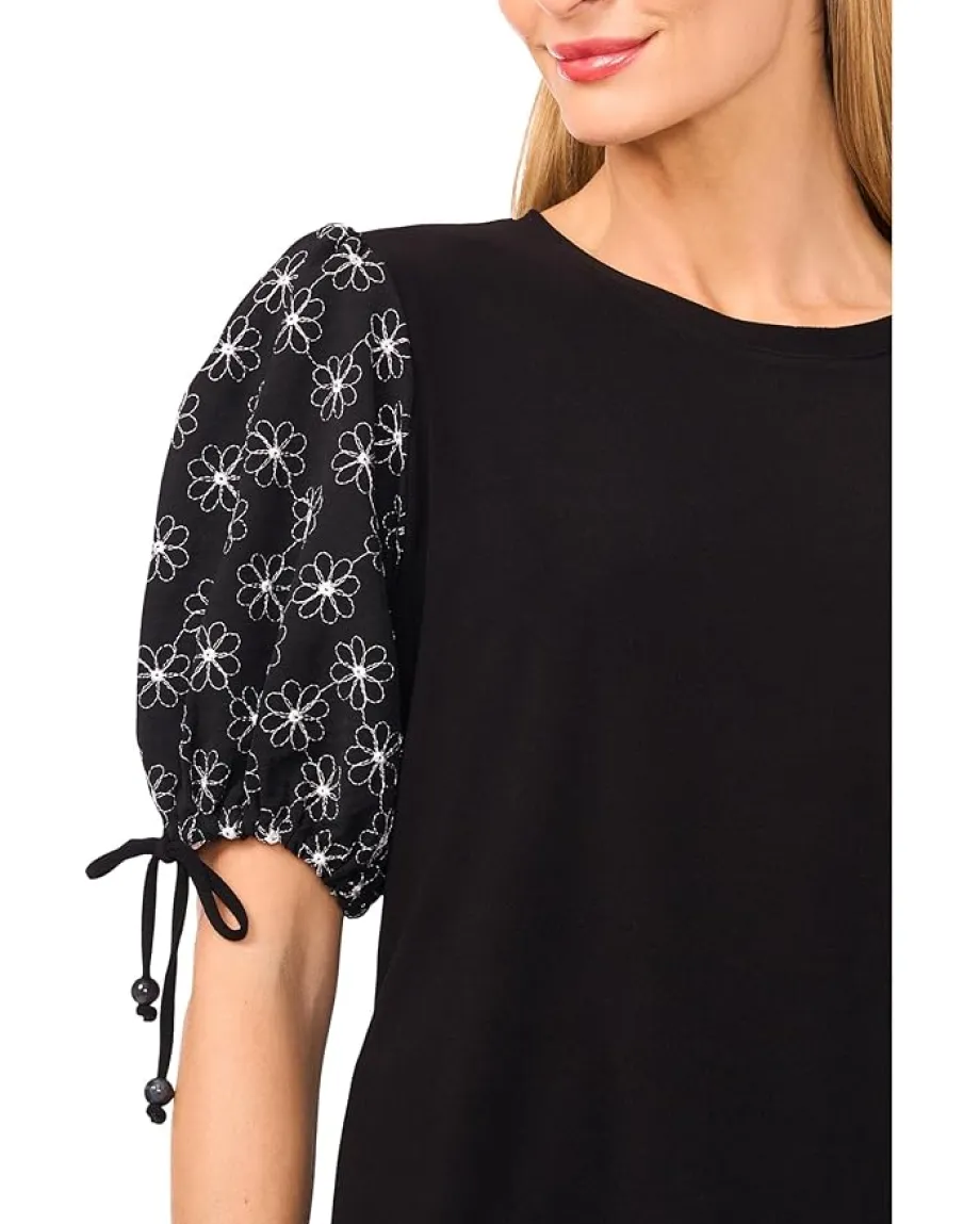 - Effortlessly chic and perfect for any occasion, the CeCe™ Floral Embroidered Balloon Sleeve Knit Top brings a fresh twist to your wardrobe. Crafted from a soft crepe knit fabric, this pull-on style top combines comfort and style with an elegant jewel neckline and beautiful floral embroidery on the balloon sleeves.