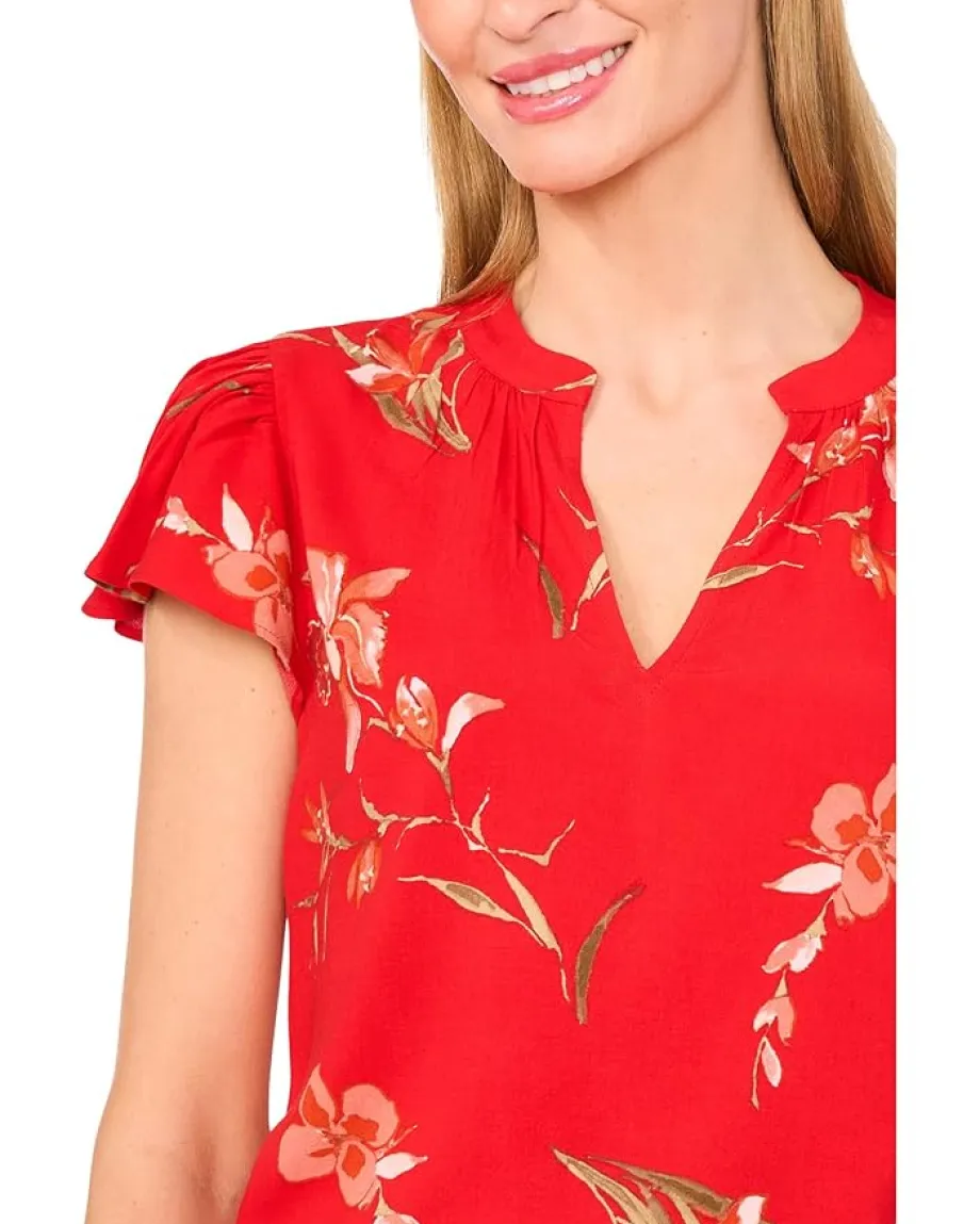 - Effortlessly feminine, the CeCe™ V-neck Shirred Neck Flutter Sleeve Blouse features a delicate shirred neckline and flutter sleeves for a soft, flowy silhouette. The V-neck adds an elegant touch, while the viscose fabric provides superior comfort and breathability. Featuring an allover floral print, this printed top is perfect for both office wear and casual outings.