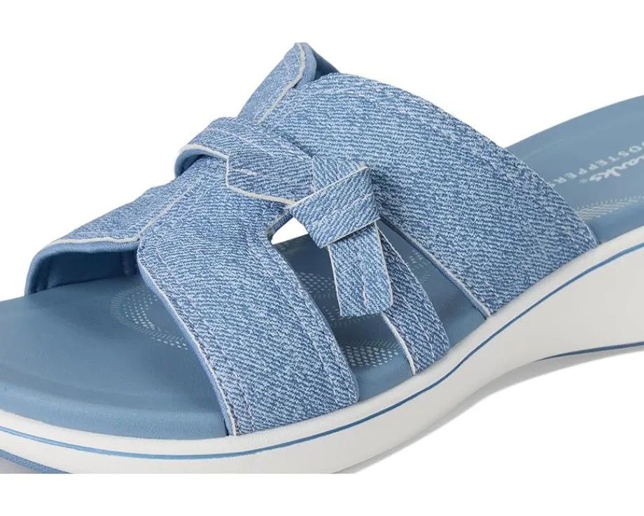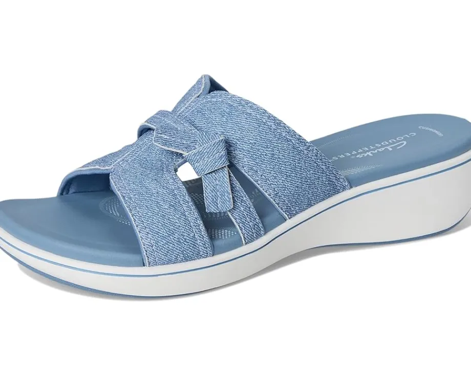 - Clarks™ eye-catching Cloudstepper Breeze Rae Mia is as practical as it is stylish with its soft denim-look upper and bouncy molded EVA footbed. Crafted with heavy-stitch details and a knotted accent, its featherlight outsole is complete with a signature Breeze stripe for a fun punch of color. The sandals feature premium denim look wipe-clean PU nubuck upper, smooth jersey lining that feels soft against the foot, and slip-on profile with subtle elastic for easy on and off and secure fit.