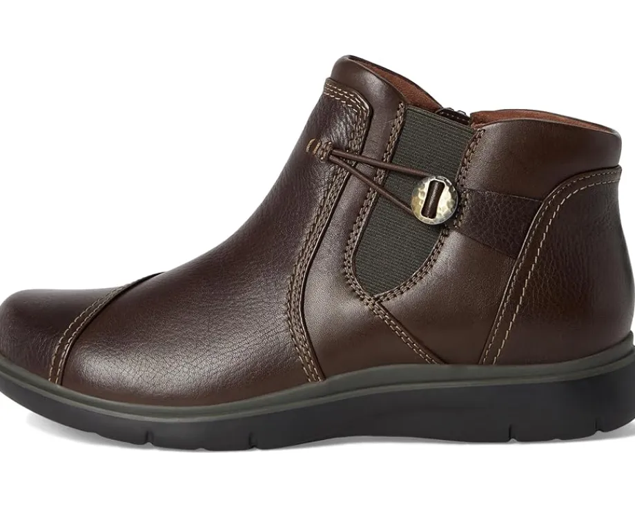 - An elasticized gore panel and side zipper for easy entry accentuate the Clarks® Certina Joy Ankle Boot. Featuring a roomy round toe shape, the footwear has leather upper, lining, and suede insole.