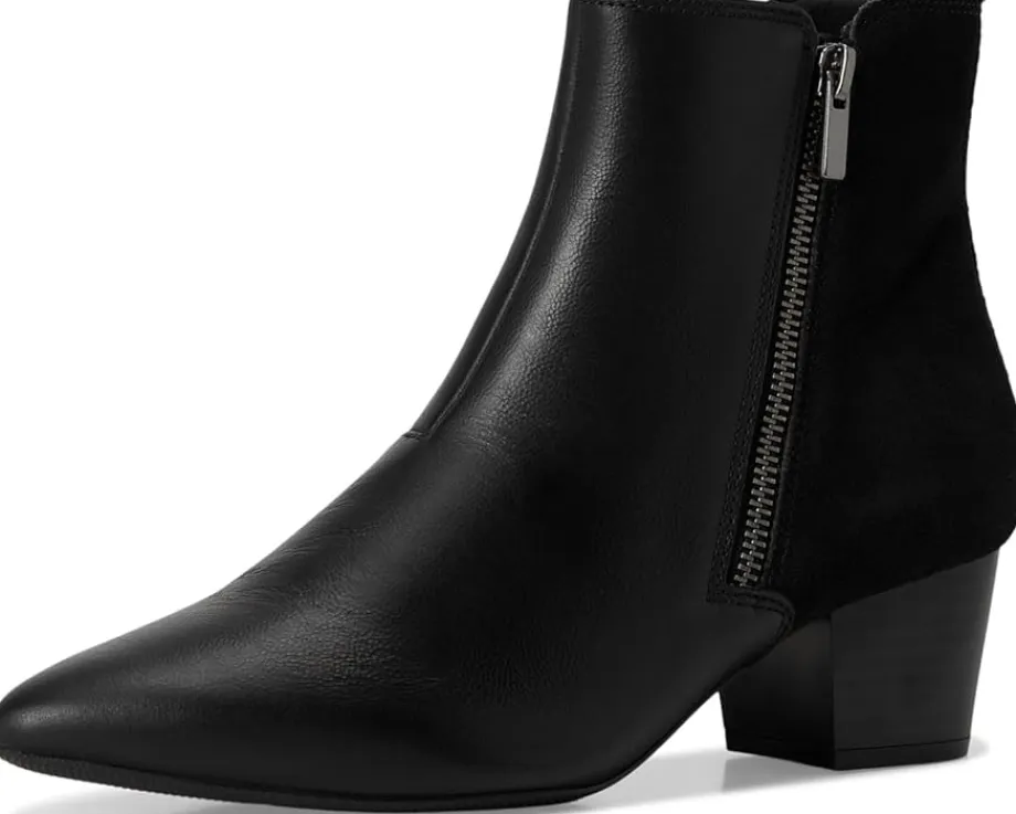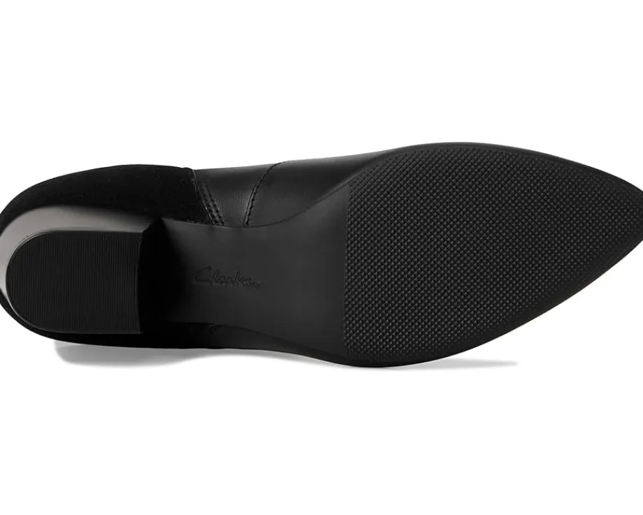 - Exude sleek sophistication wearing the Clarks™ Ellanie Vibe Boots, designed in a pointed toe silhouette with a solid block heel. The ankle-high boots are crafted with a black leather & suede upper, mesh lining, and a 5mm Ultimate Comfort foam footbed that delivers lasting cushioning. The side zipper closure ensures a secure fit.