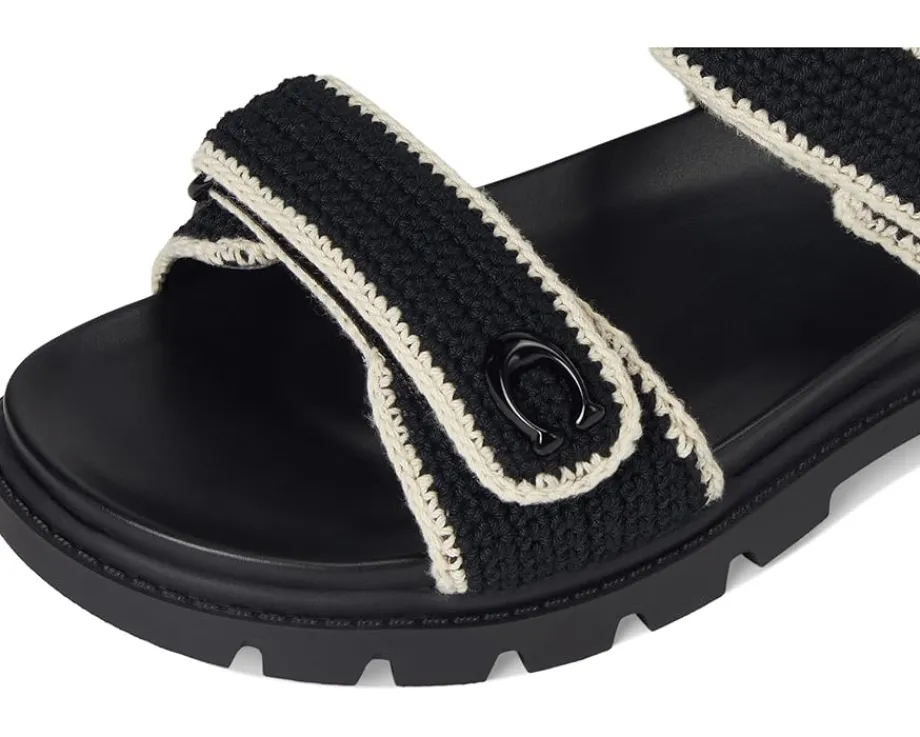 - Comfort and functionality blend together in the COACH® Brynn Crochet Sandals. Crafted with a crochet upper, man-made leather lining, and man-made leather footbed, these open round-toe sandals offer enhanced comfort with every step you take. The double hook-and-loop closure and backstrap ensure a secure fit.