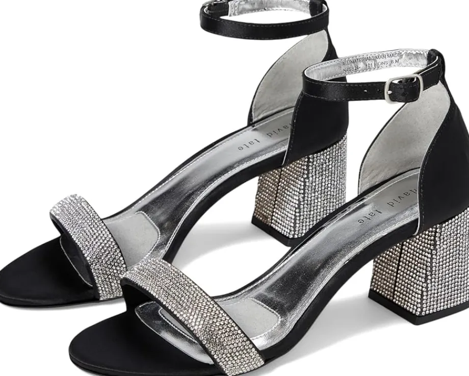- A gorgeous and glamorous pick for your evening parties, the David Tate® Icon Heels showcase a premium quality satin upper perfectly teamed with shimmery rhinestone embellishments on the toe strap. Equipped with a feminine buckle strap closure at the ankle, the shoes look more stylish with the high quality sockliner made with satin, suede, and soft leather and surrounded by a metallic frame. The rhinestone-covered block heel lifts your look with some added charm.