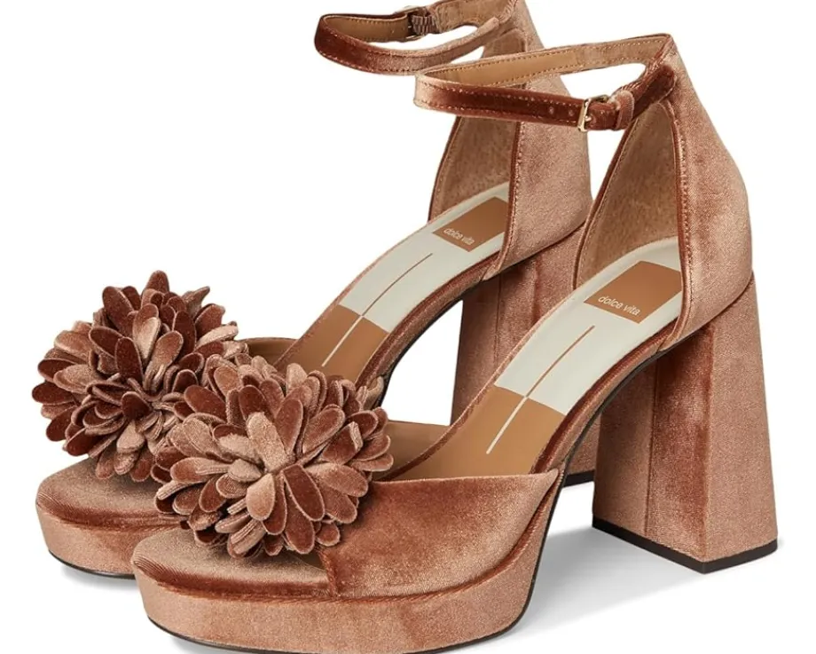 - The Dolce Vita® Perel Heeled sandals, a standout platform sandal that pairs whimsical detailing with evening poise. Draped in luxe velvet and accented by a soft pom-pom ornament, these heels balance statement style with wearable design.