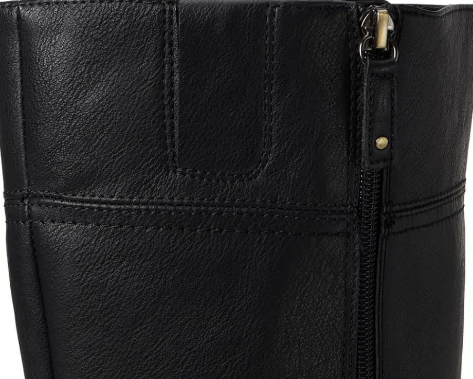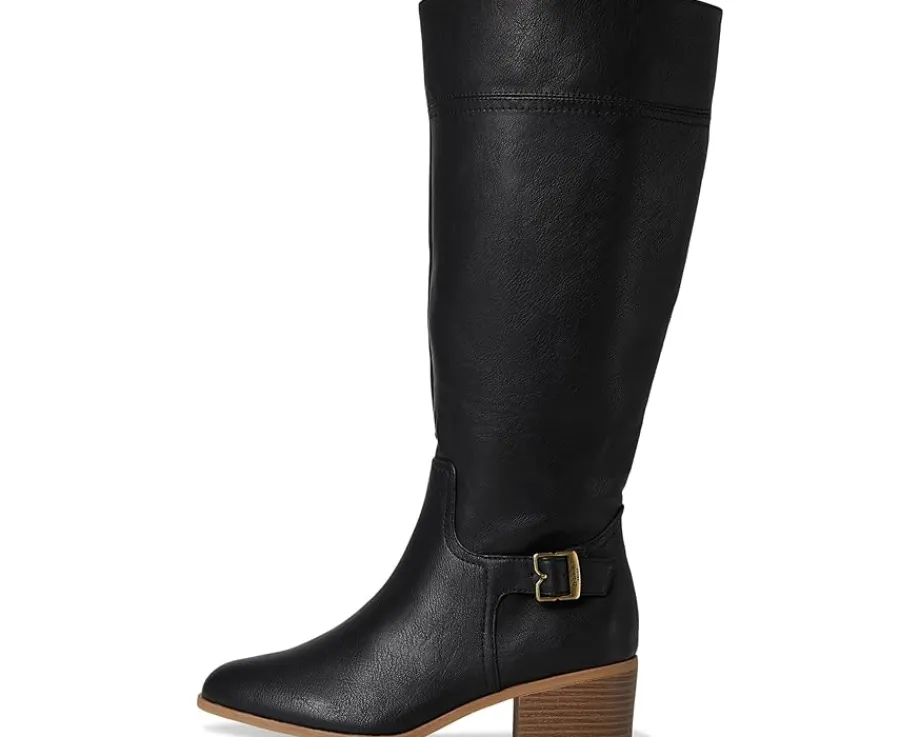 - Riding boots for women designed with innovative comfort. Crafted from a faux leather upper, these boots offer an inside zipper for a secure fit, iconic buckle detailing, stitch accents, and a stacked heel.