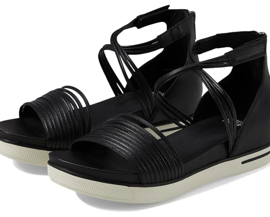 - Keep going through the streets wearing Eileen Fisher® Shea footwear. It features leather upper, breathable leather lining, and molded footbed for comfort. A multi-band design with crossing ankle strap has a hook-and-loop strap to adjust the fit. A back zip for ease to get the sandal on and off.
