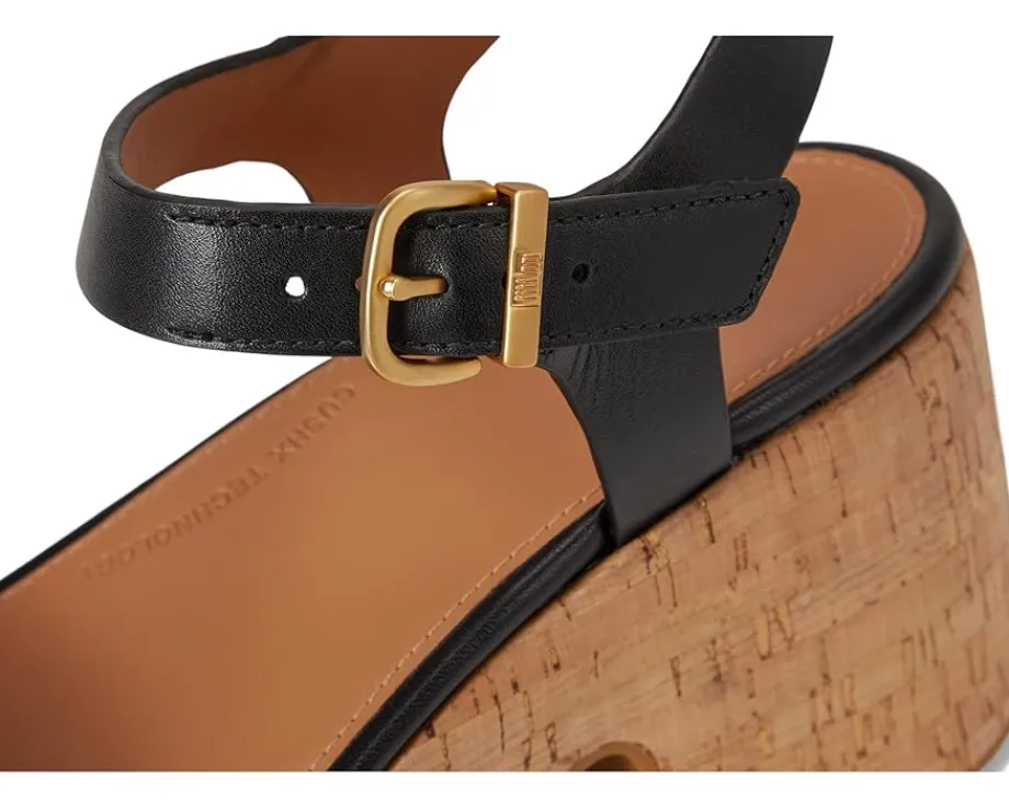 - Modern and refined, the FitFlop™ Platforms Leather/Cork Heeled Ankle-Strap Sandals are possibly the world’s most comfortable high heels. Soft, light, and superbly cushioned, these espadrille fisherman sandals team a strappy raw-edge leather upper with a classic high-wedge rubber outsole, wrapped in natural jute for summery vibes. A curvy brushed-metal buckle adjusts the fit and an anatomically contoured leather footbed diffuses pressure & gives natural arch support. Their CushX midsole has soft EVA cushioning inside a firmer EVA shell, with heel-to-forefoot angle/contoured top line optimizing alignment and comfort in high heels while the polyester lining offers breathability. The adjustable ankle strap with a metal buckle ensures a perfect fit. Ergonomically engineered to help optimize your body’s alignment, natural movement & energy, these heeled sandals feature an impact pillow at the forefoot for extra cushioning.