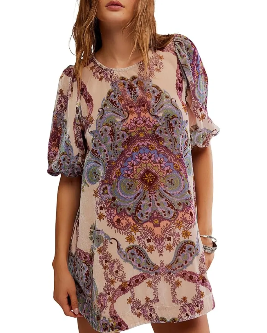 - Boho luxe vibes in the Free People™ Maye Printed Velvet Tunic. Designed with a relaxed, shapeless silhouette, this tunic drapes beautifully over your frame for a carefree, flattering fit. Crafted from sumptuous velvet fabric, it features a brocade-inspired print that exudes vintage charm with a modern twist. Banded sleeves add a subtle structure while maintaining flowy comfort, and the back keyhole detail delivers a hint of unexpected allure. Pull-on styling makes getting dressed effortless, and the above-the-knee length gives you versatile styling options. Pair it with leggings, boots, or statement heels for a look that transitions seamlessly from brunch to evening escapades.