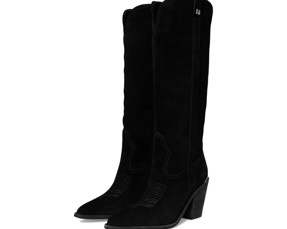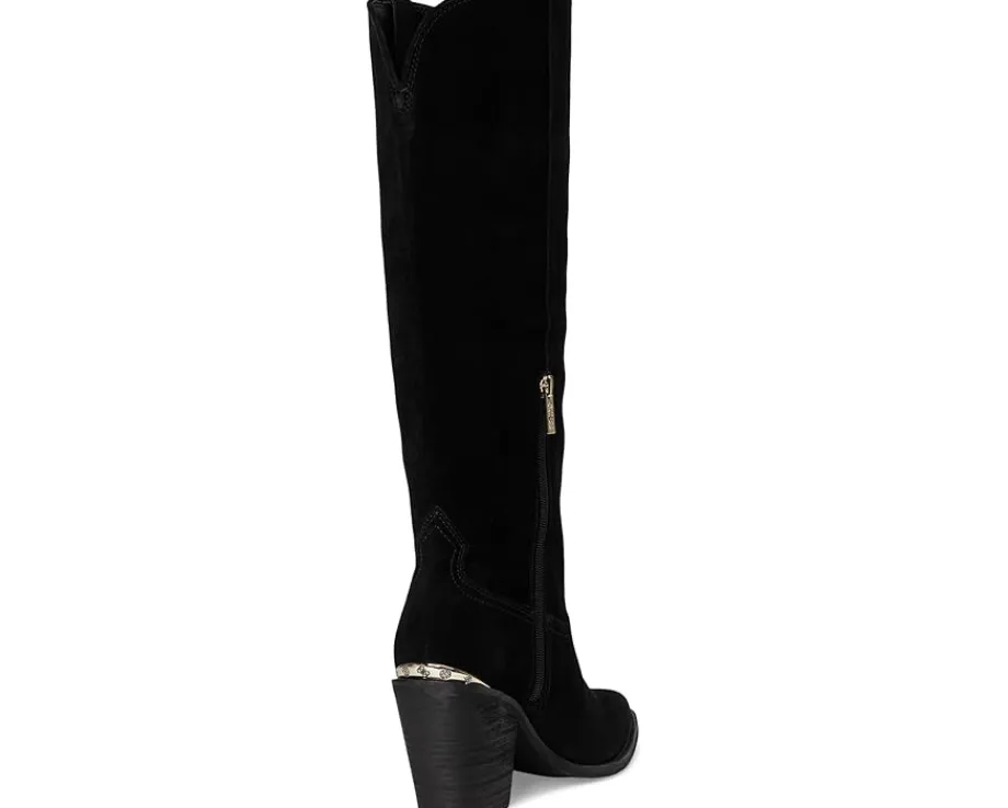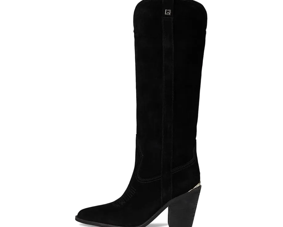 - The Sashan by Guess® offers a curved topline knee-high boot in beautiful suede materials. This stacked heel featuring topline stitching mimics Western flair. Made from soft suede upper, polyurethane lining, padded insole, and rubber outsole.