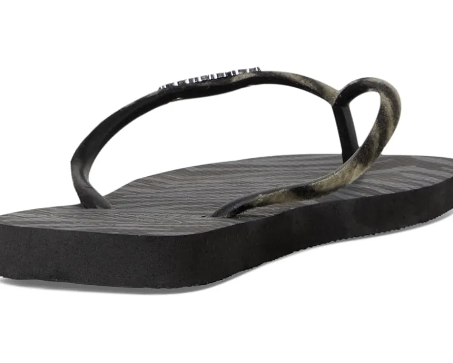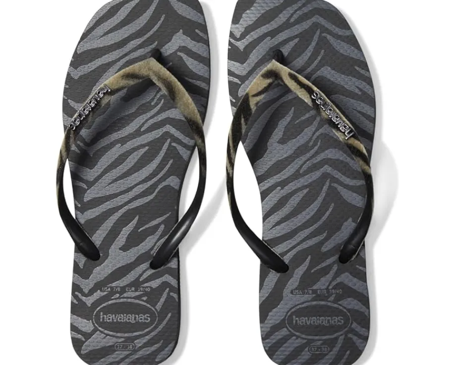 - The Havaianas® Slim Square Velvet Sandals are for those who exude style! With the Slim design, these sandals feature thinner straps and a sole with a square toe. The sole also boasts an animal print, straps with printed velvet applications, and a metal Havaianas logo. Get yours now.