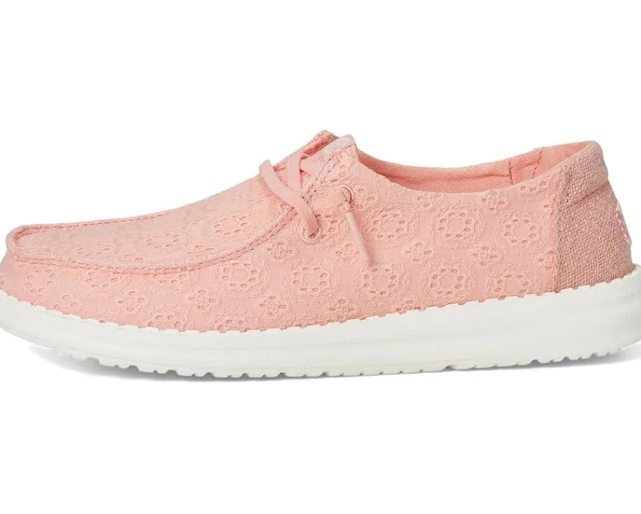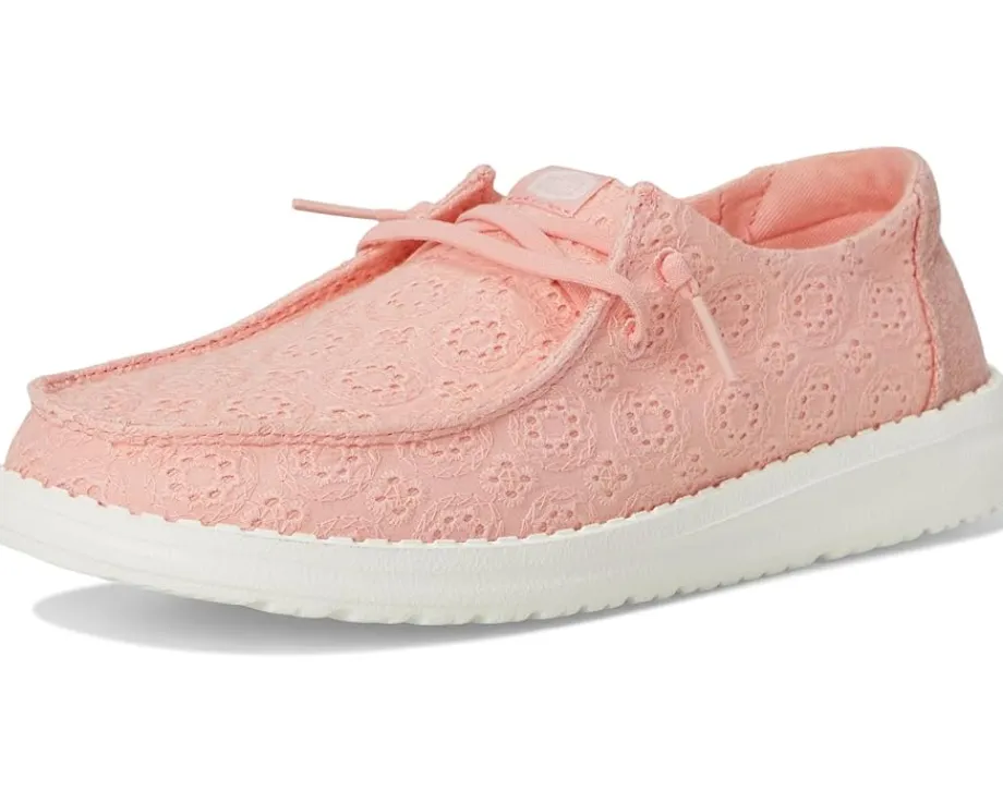 - Comfort meets confidence in the Hey Dude® Wendy Eyelet Lace sneaker. These sweet, warm weather go-to’s feature a textured eyelet upper and a comfortable fit, letting you conquer your day in style. Wendy provides everywhere comfort but with a style ideal for women who enjoy life’s ever-changing journey. The relaxed look and feel allow you to explore your passions and experience new places with the confidence your feet will fit into any occasion. The removable memory foam cushioned insole provides maximum comfort and reduces sweating and odors.