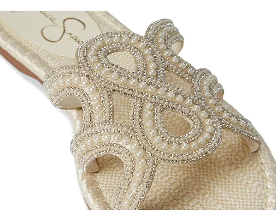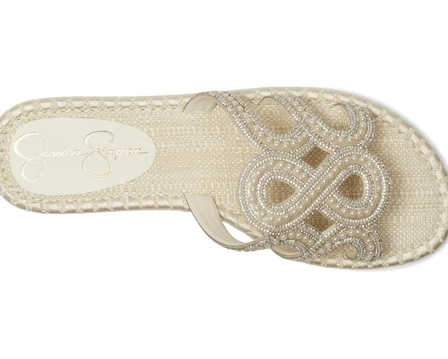 - The Jessica Simpson™ Bria Flat Woven Sandals are your go-to glam essential for warm-weather vibes and unforgettable nights. Featuring a luxe crystal-encrusted design on a breathable polyester upper, these slip-ons bring instant dazzle to casual jean shorts or dressy party looks. The comfy PU lining hugs your feet, while the cork insole offers lightweight cushioning for lasting wear. Finished with a durable rubber outsole and an open toe that lets your pedicure shine, the Bria Sandals are perfect for wedding dance floors, rooftop cocktails, or beachside strolls.