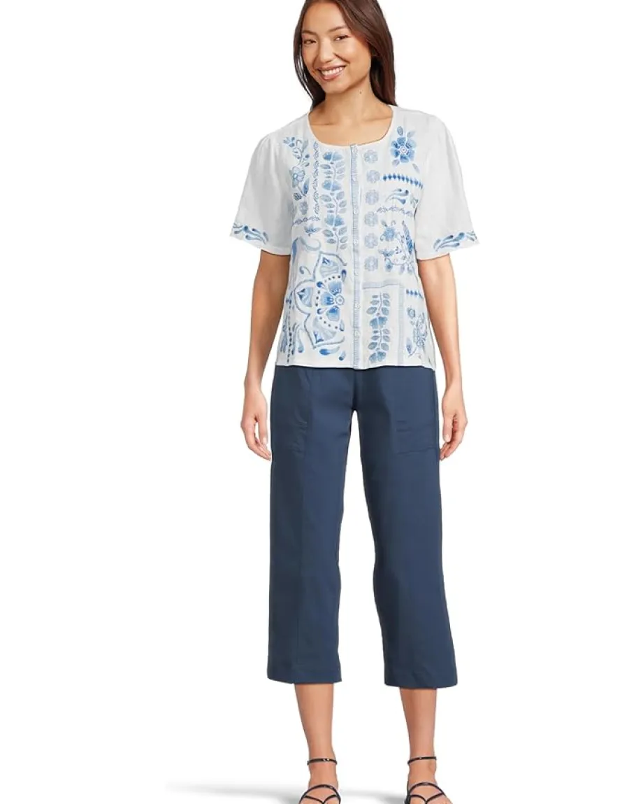 - Chic and cheerful, this white boxy-fit top features intricate sky blue embroidery arranged in a patchwork tile design. The round neckline and short sleeves keep it classic and easy to wear, while the artisan-inspired detailing adds a standout touch. Lightweight and breathable, it’s the perfect piece for sunny days and seaside strolls-especially when paired with crisp shorts or linen trousers.