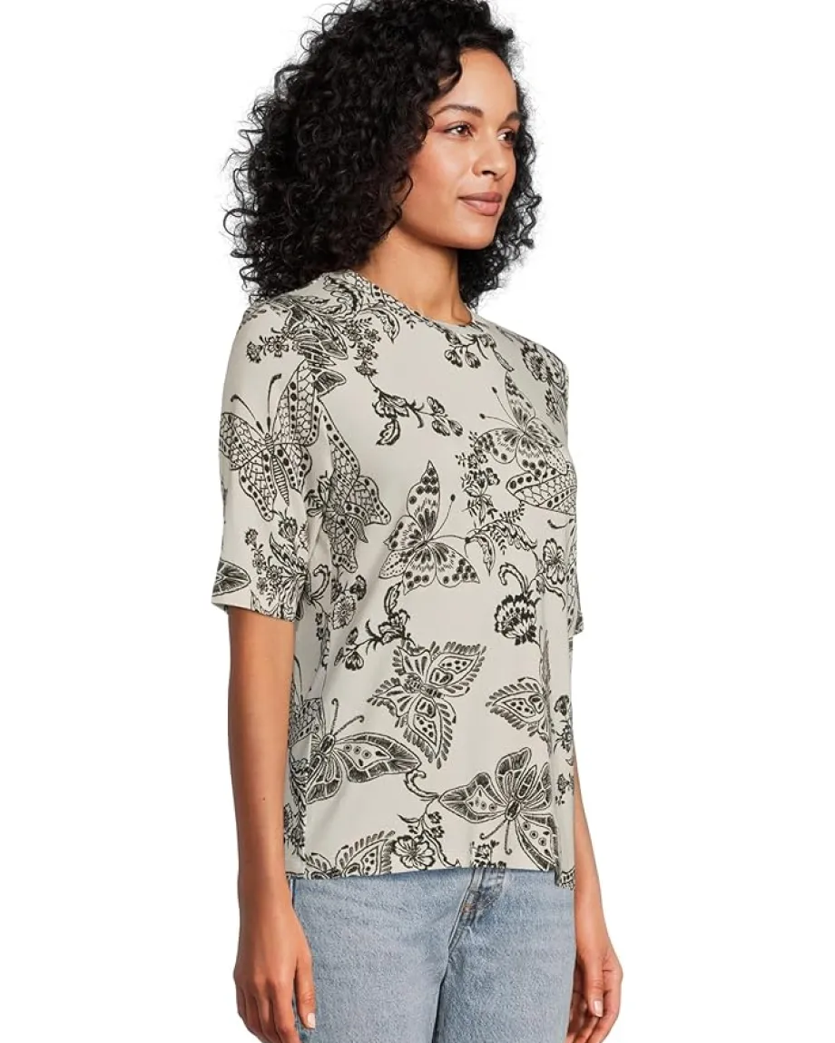 - Effortlessly elegant, this tee features a delicate allover butterfly and floral print that brings a touch of nature-inspired charm. The silhouette and slightly extended short sleeves offer a polished, modern look, while the soft fabric ensures all-day comfort. Perfect for dressing up with trousers or keeping it casual with denim.