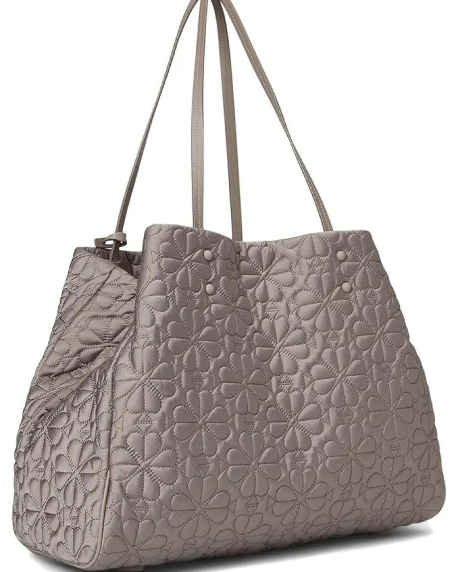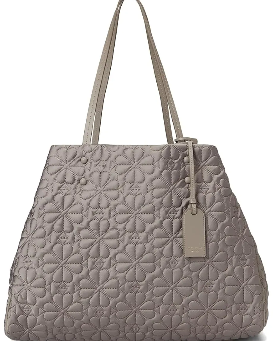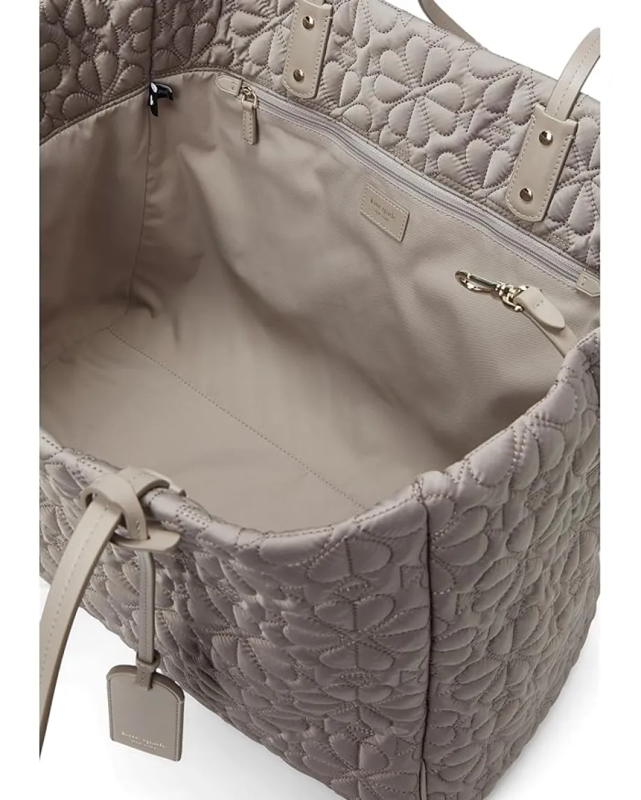 - Blossom in style carrying the Kate Spade New York® Tilly Quilted Tote. Turn heads with this timeless tote featuring a chic quilted flower design that adds a playful elegance to your every day. Crafted with luxurious leather material and lining, it offers both durability and sophistication. The spacious interior and two zippered compartments ensure effortless organization, while the shoulder straps provide versatile wear for workdays or weekend outings. Large enough to carry all your essentials-yet stylish enough to complement any outfit-this bag is the ultimate blend of practicality and charm.