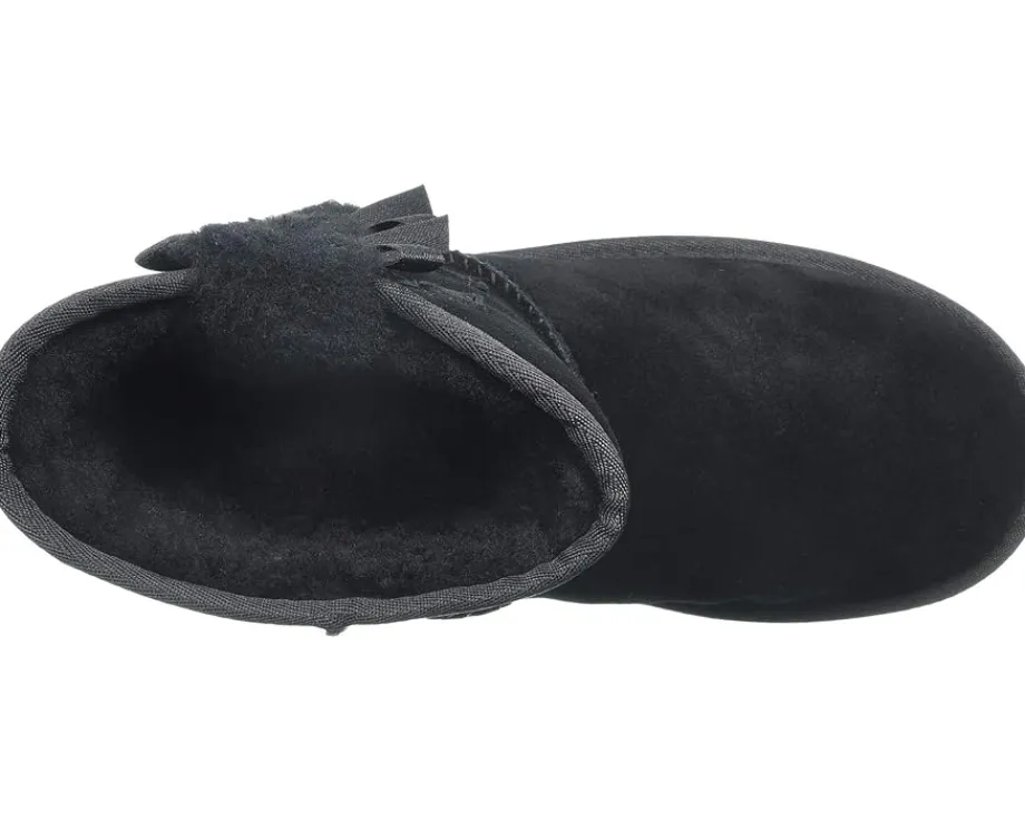- Soft suede upper adorned with dainty bows and a row of plush, exposed sheepskin.