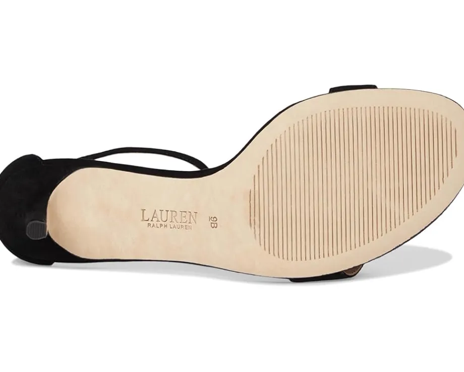 - A polished “LRL” logo accents the vamp of the Lauren Ralph Lauren® Allie Mid-Heel Suede Sandals, which feature a thong silhouette in an eye-catching, metallic Nappa leather upper. These heeled sandals are made of a padded leather insole and leather lining. The buckled ankle strap offers a secure fit. Walk with confidence wearing these leather heels.
